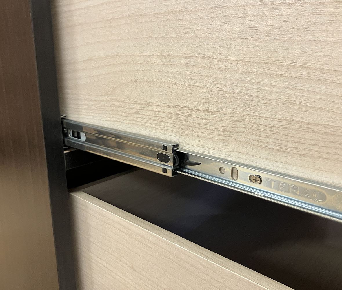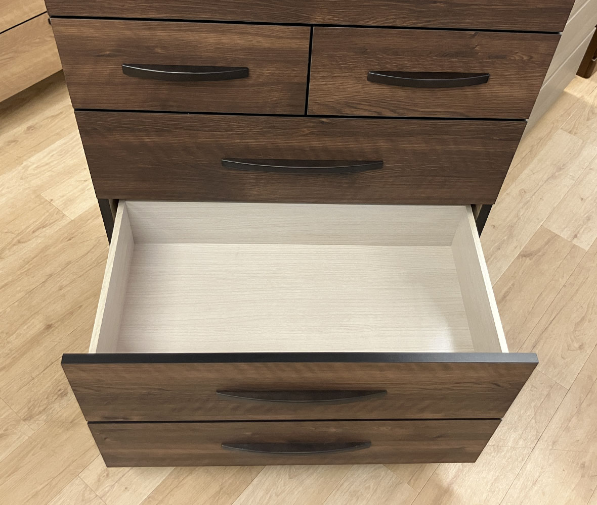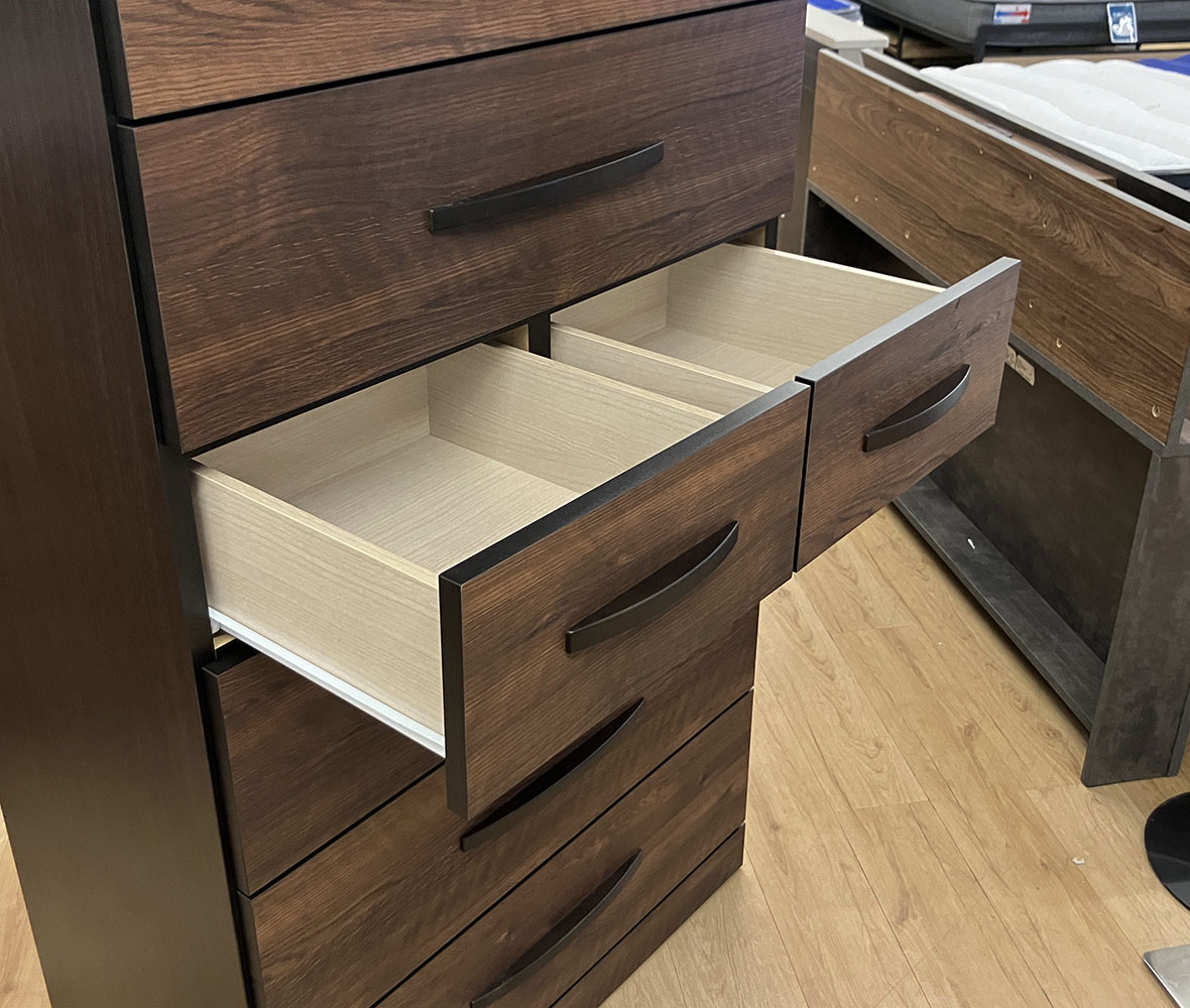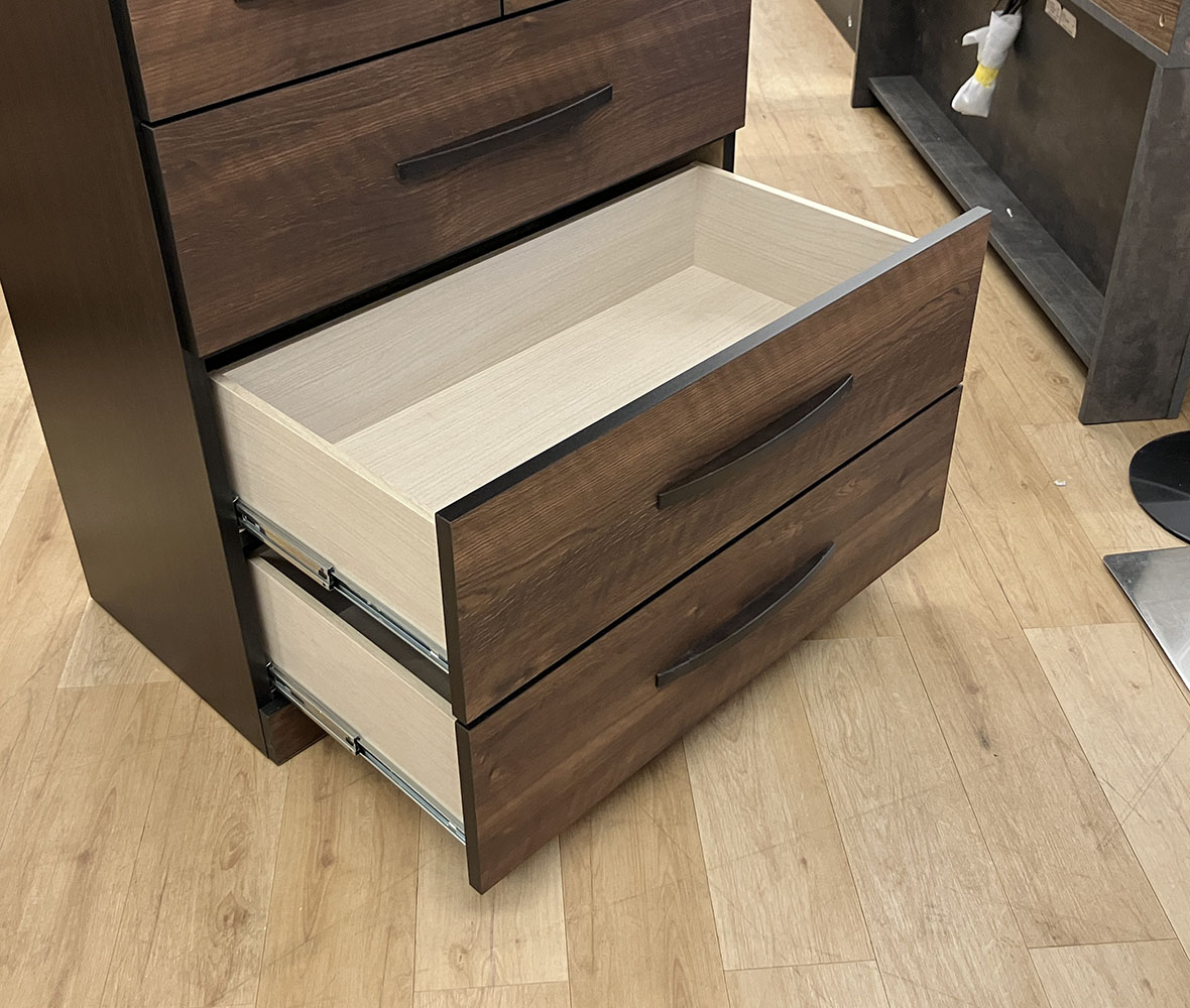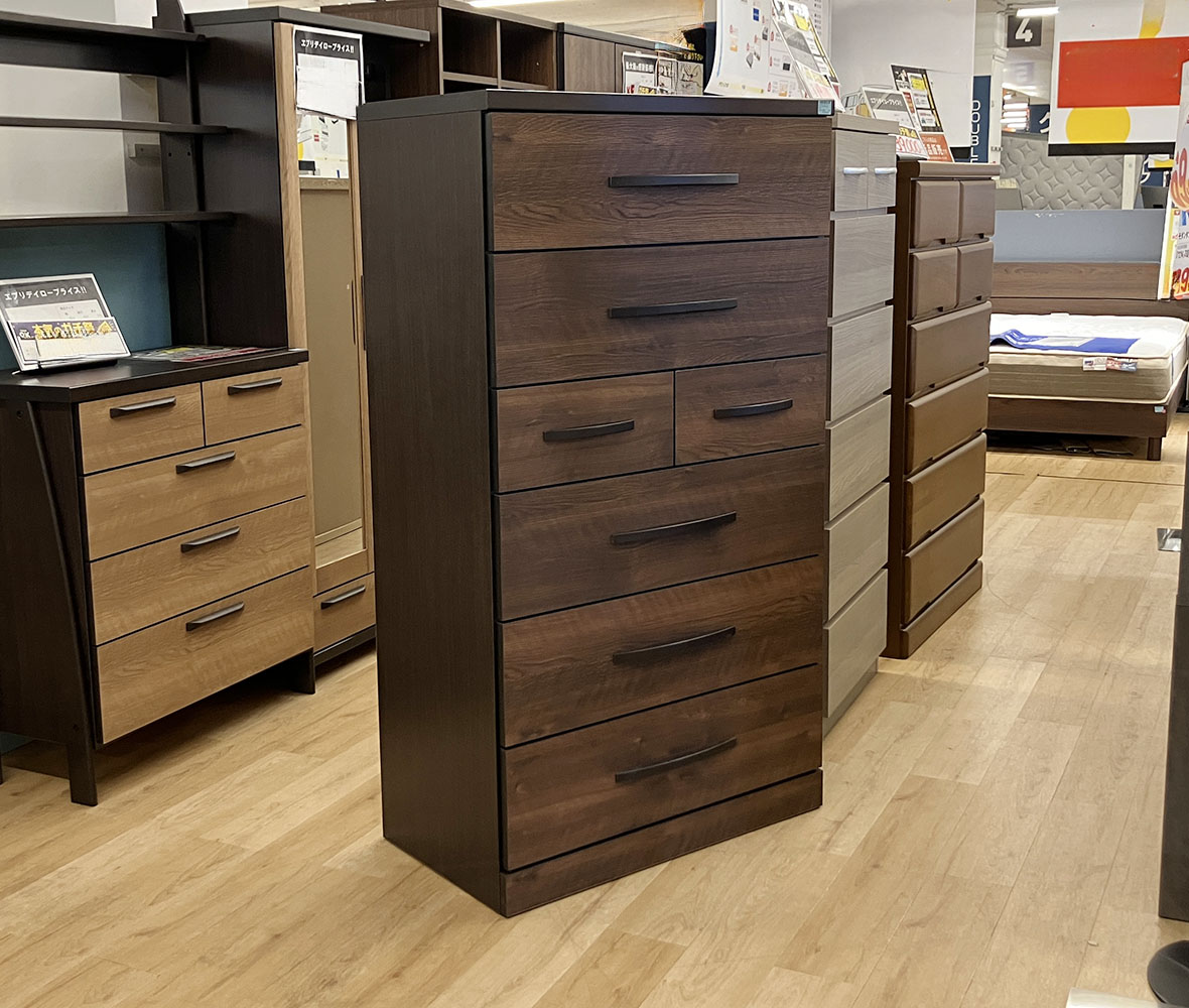 美しい木目と濃い色のバイカラーがオシャレなハイチェスト!7つの引き出しで収納力抜群!長引き出しはフルオープンレール付きで、衣類をたくさん収納しても最後まで軽々引き出せます。