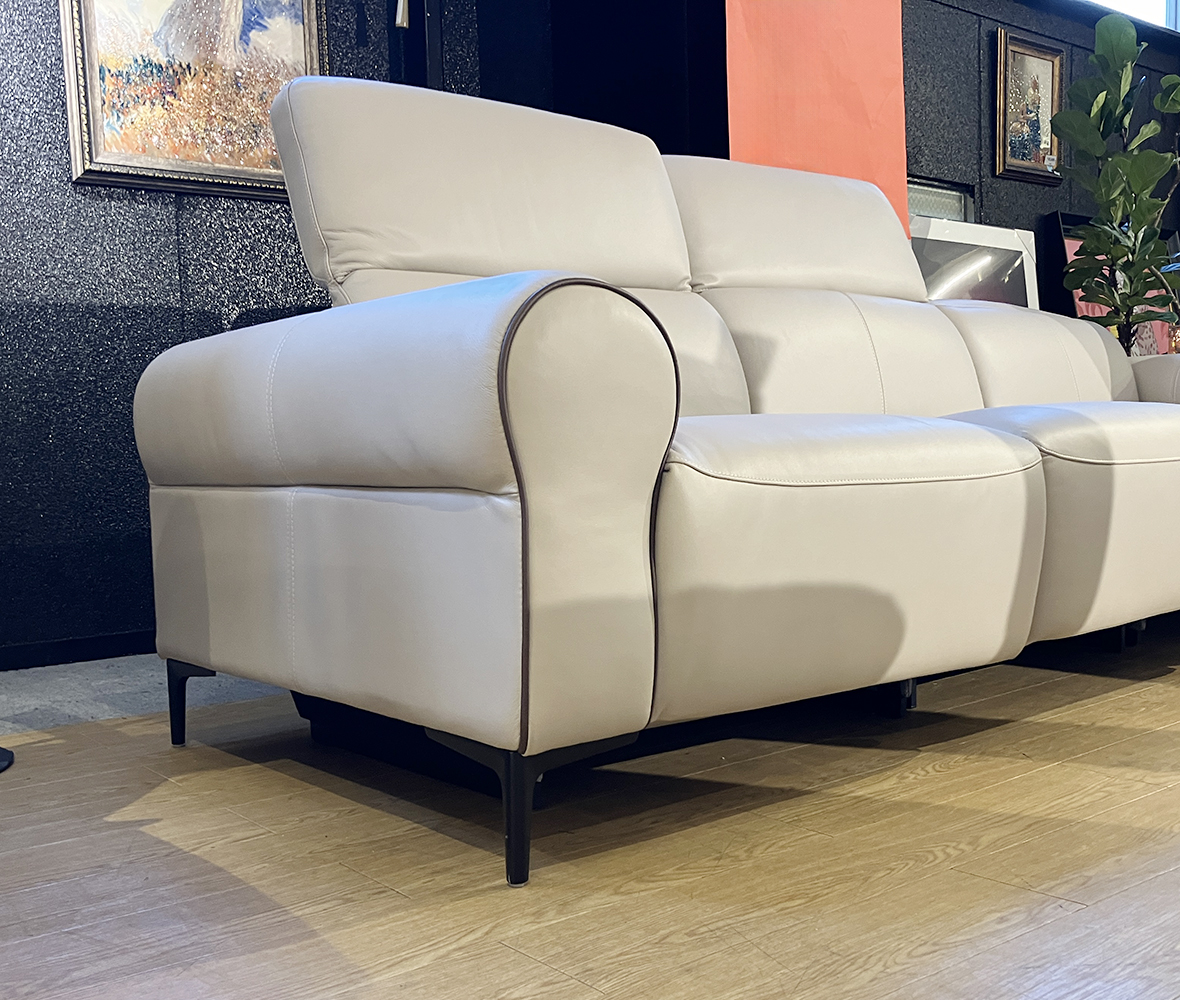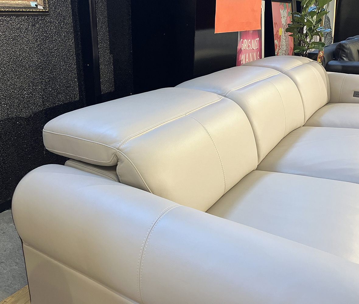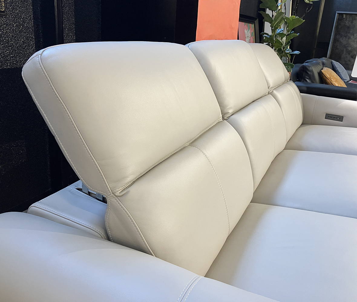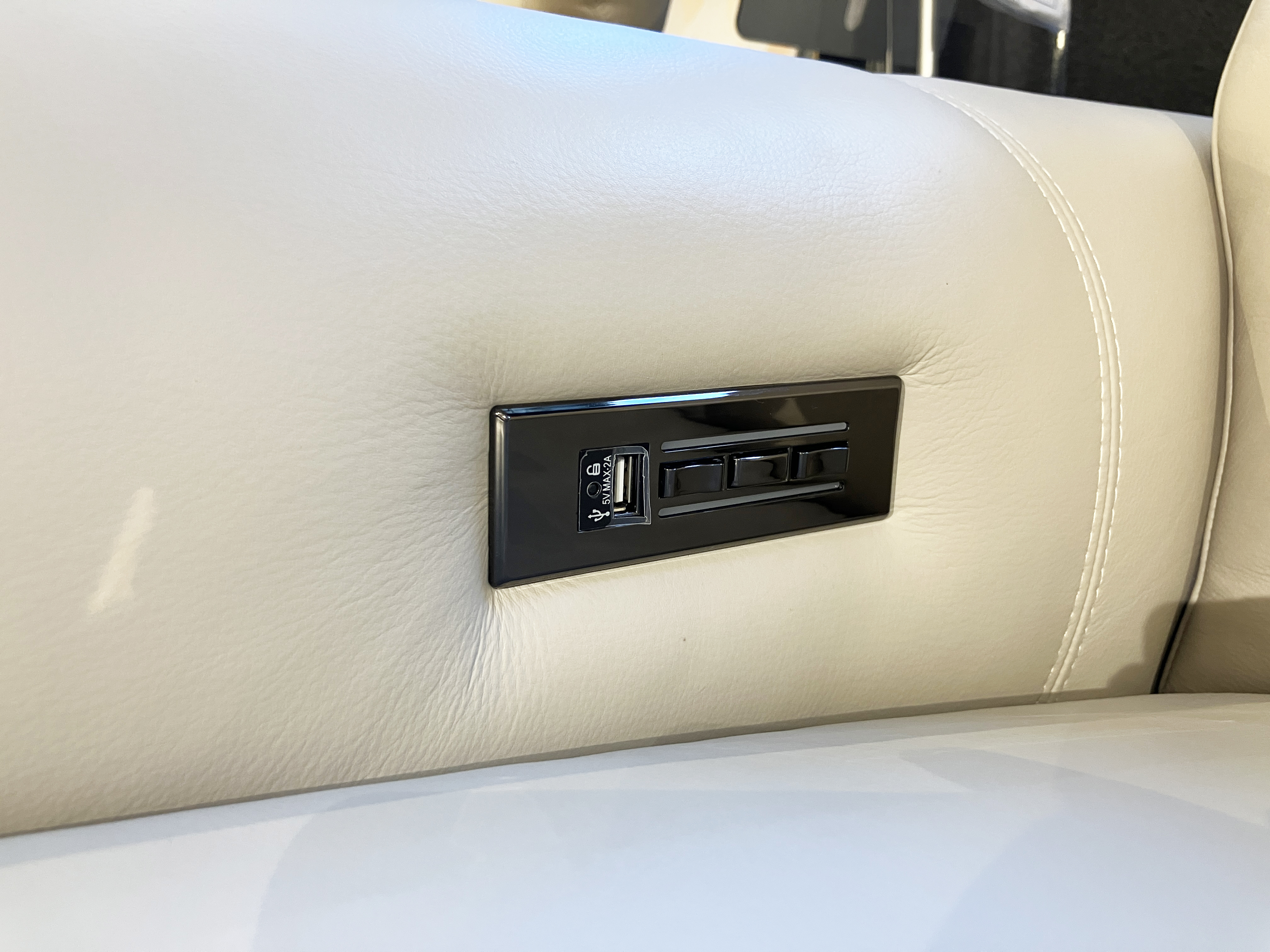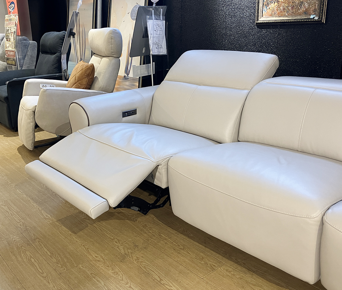 <#プレミアム1点限り>ワンランク上のくつろぎ◎総本革仕上げの #電動リクライニングソファ。両サイドの座席それぞれに 2モーター電動リクライニング機能◎背もたれとヘッドレストを独立して調整できるから、お好みの角度でしっかりリラックス♪さらに、手元の USBポート付きスイッチでスマホ充電も快適◎