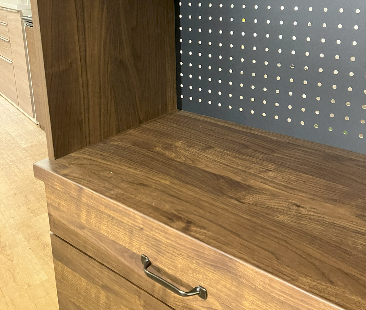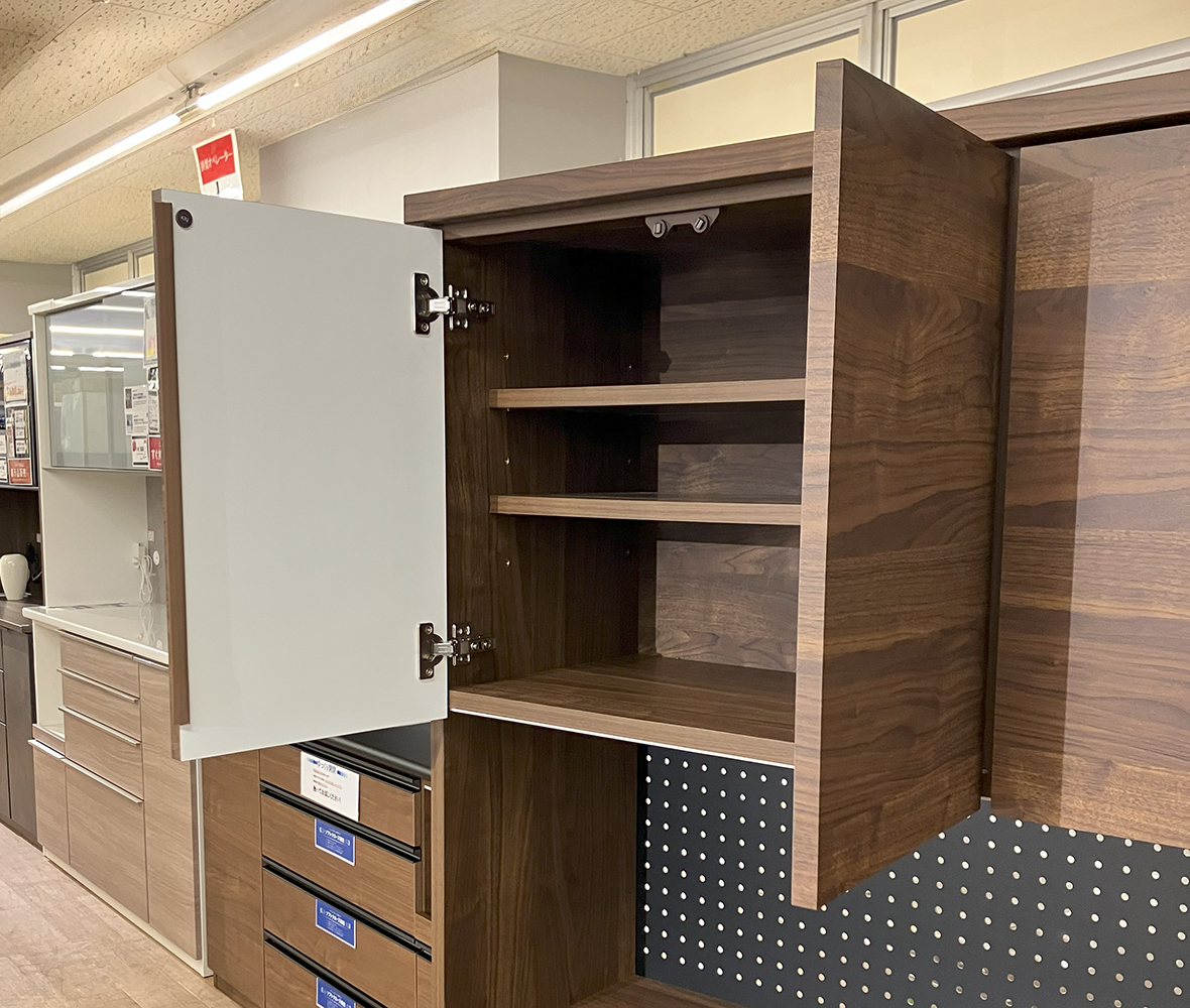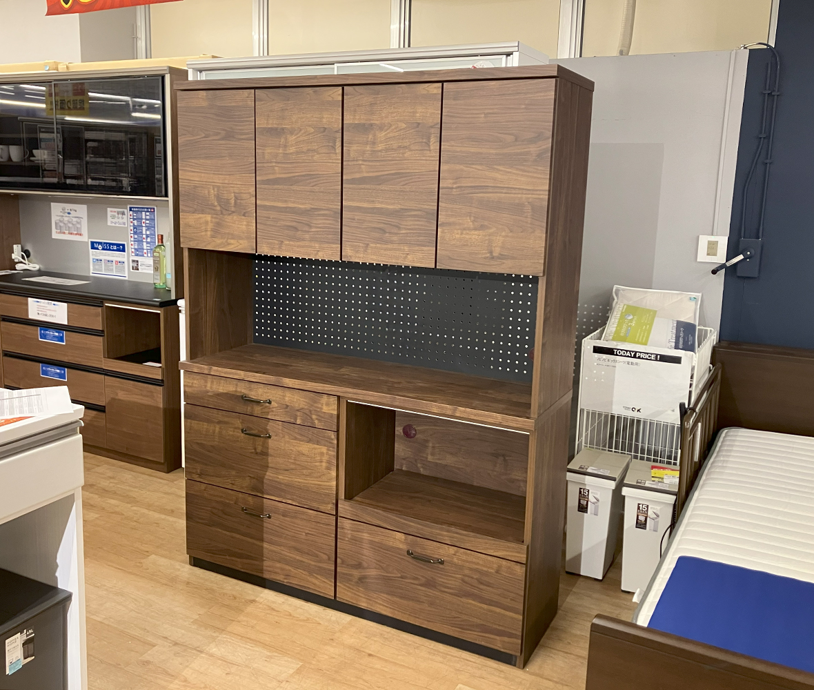 高級感ある落ち着いたウォールナット色#キッチンボード。高さ181cmは上段棚へ手が届きやすく、下台引出しはフルスライドレールで手前まで全開できます。上台オープンの背板はパンチングボード使用で通気性UP!