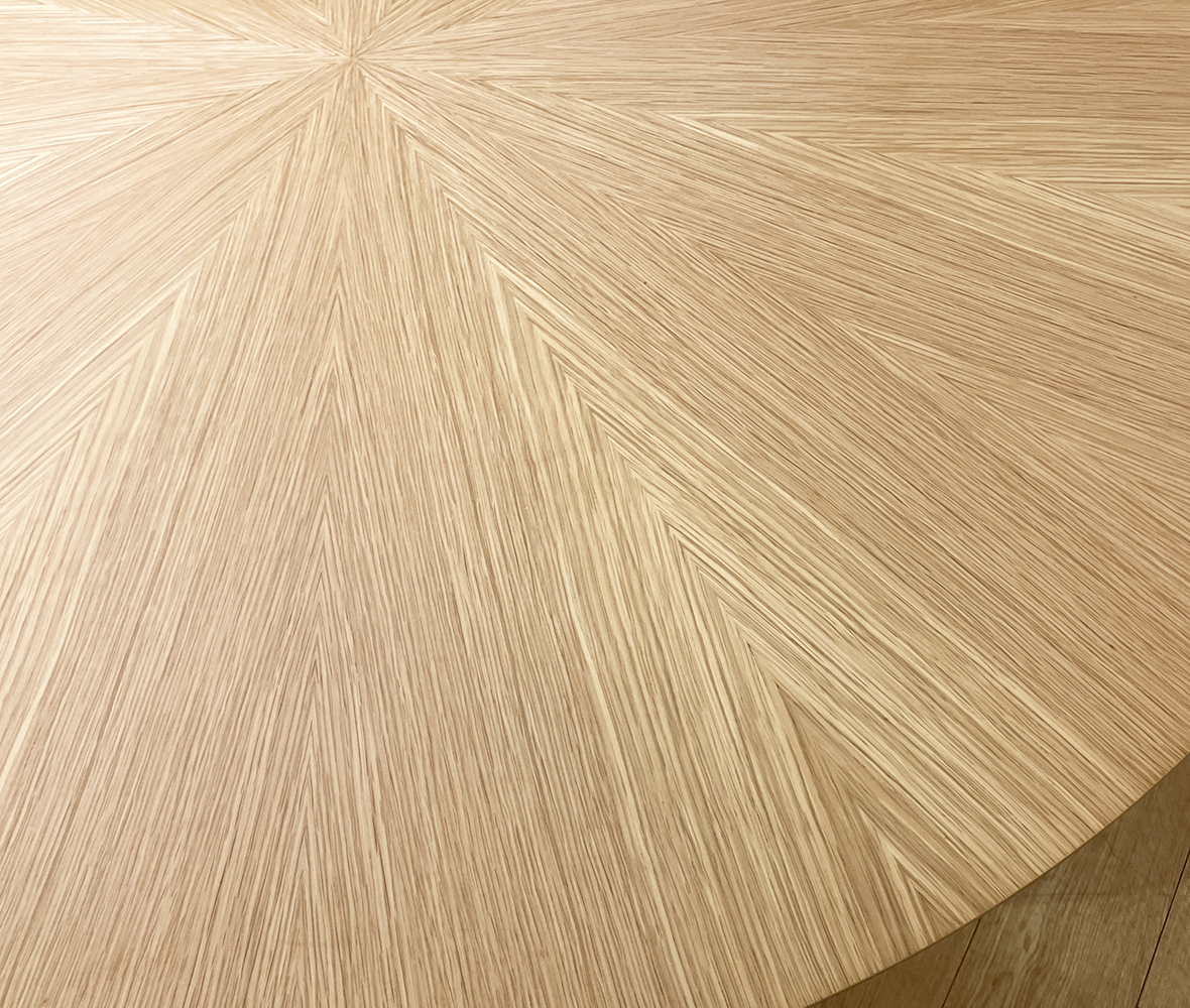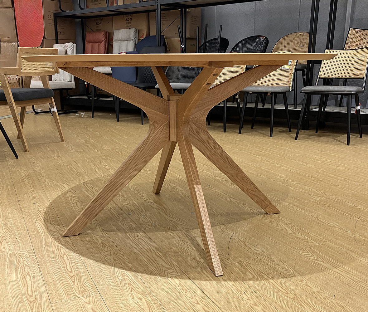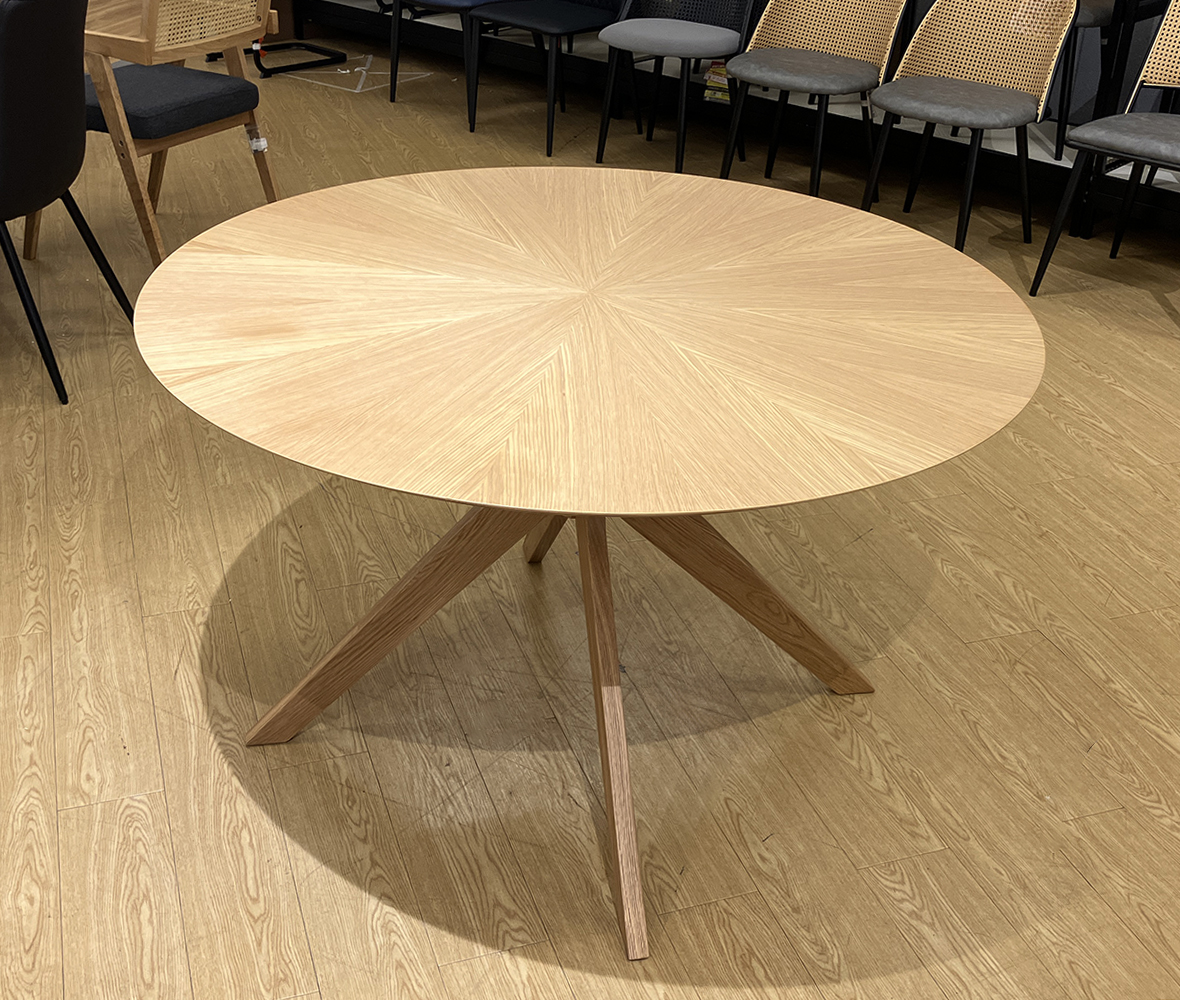 那覇店限定!天然木オーク材を使用したロングセラーの #丸テーブル。木目を組み合わせたおしゃれな矢張仕上げで、美しい矢羽模様が広がるおしゃれなデザイン◎個性あふれるクロス脚が、ダイニングをスタイリッシュに演出します。