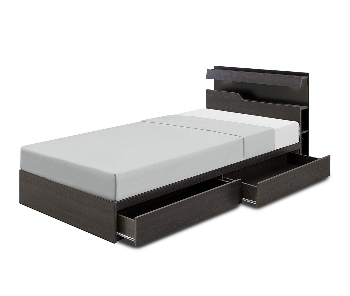 引き出し付きで収納力◎ベッドボードには宮棚付きで、スマホやメガネ置きにも便利!マットレスはふんわり心地よいポケットコイルタイプの #シングルベッド セットです。