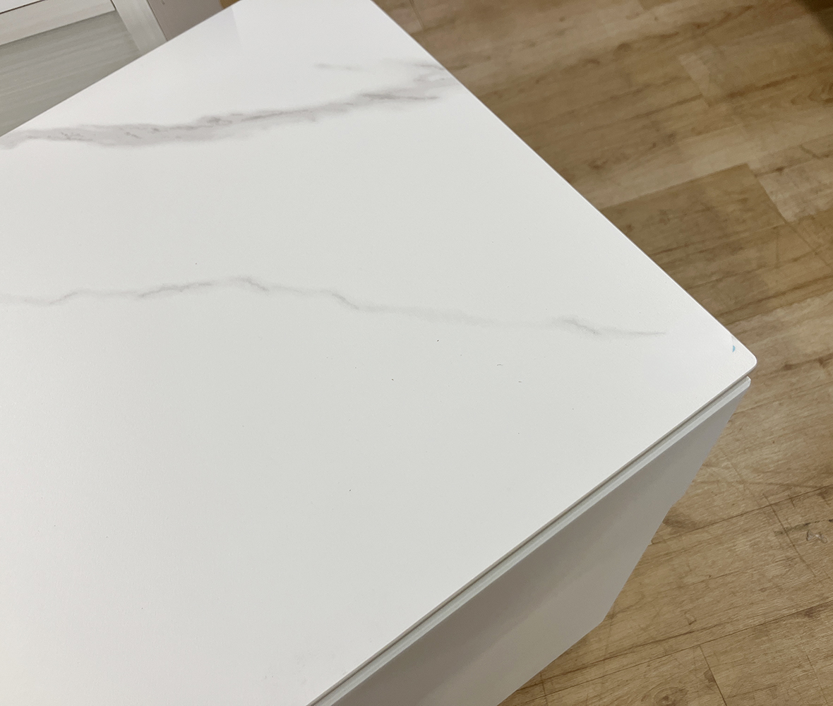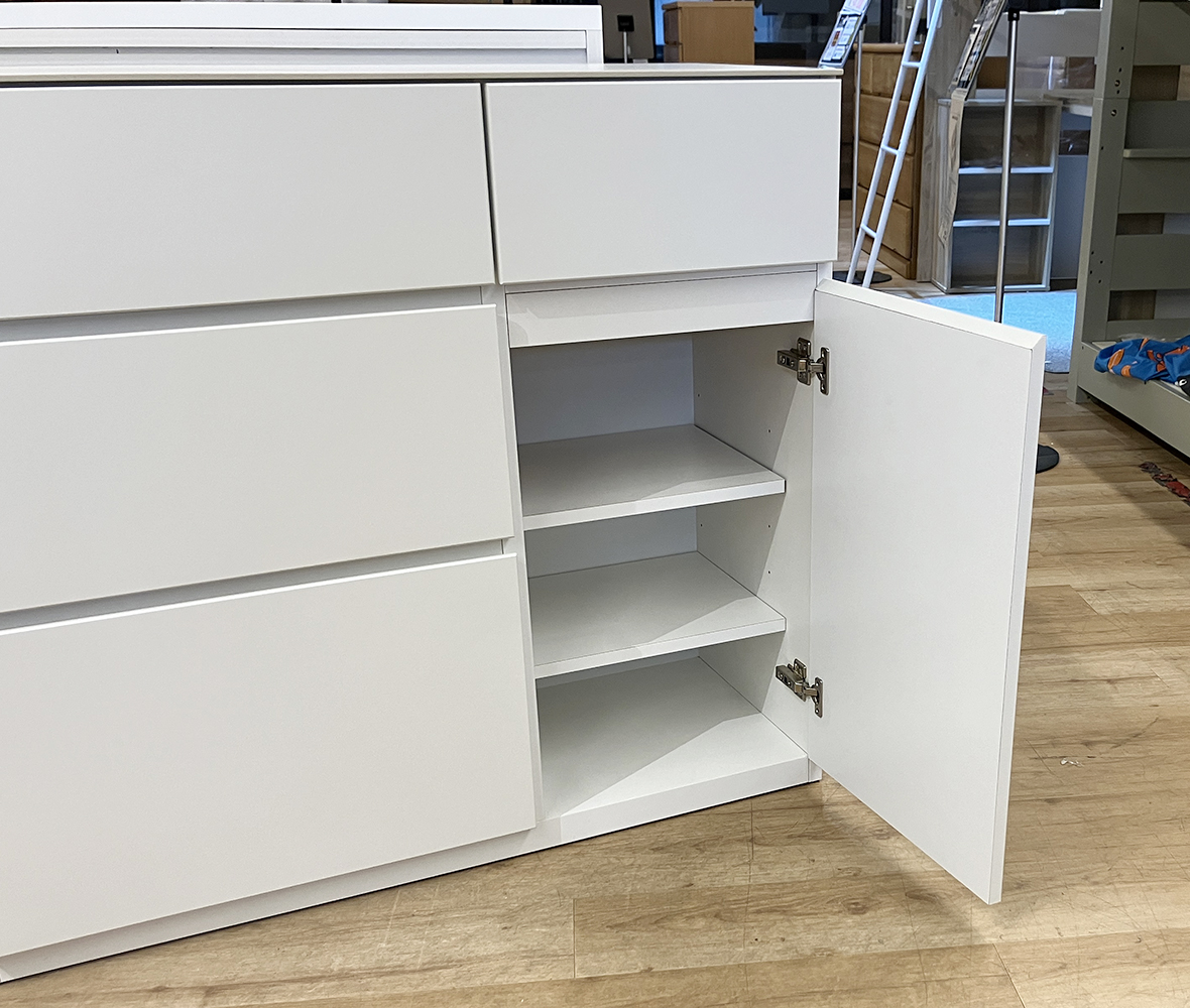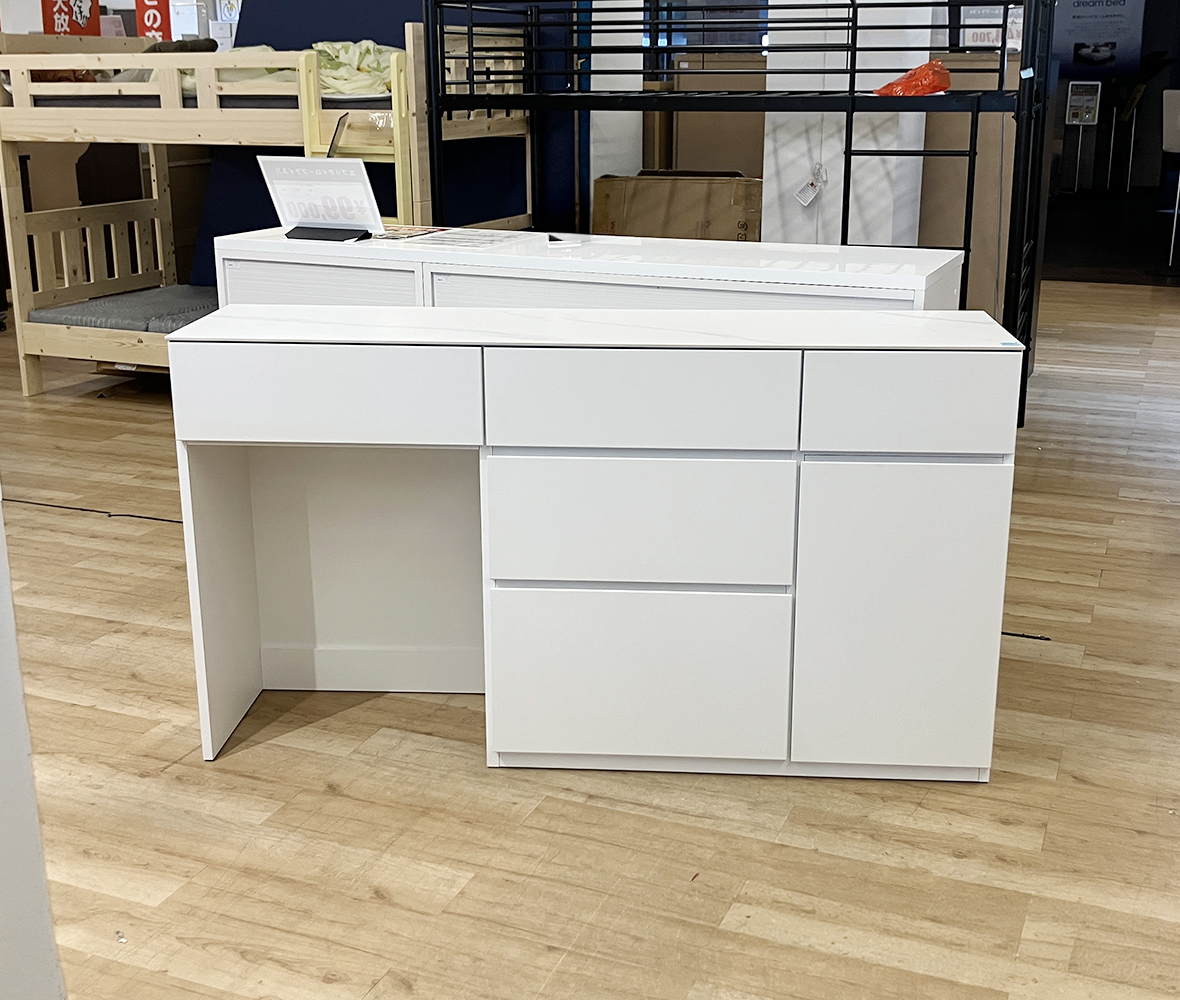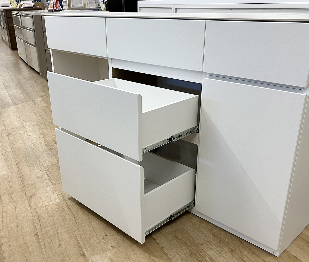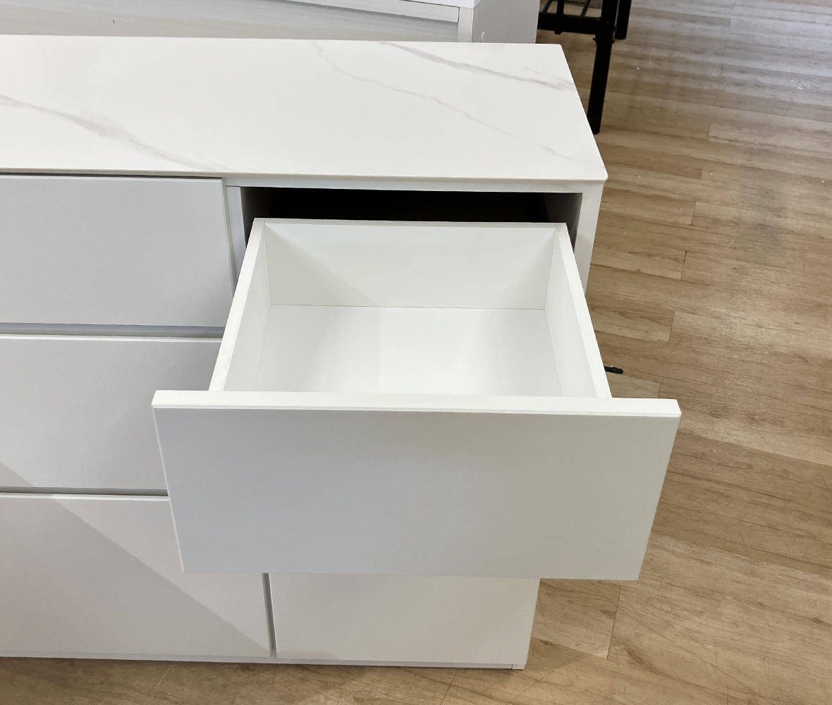 ゴミ箱の置き場にも困らない◎清潔感あふれるホワイトに大理石調の天板が映える #ダイニングボード。収納もたっぷりで、引き出しや扉収納で細かく整理整頓!シンプルながら使い勝手にこだわった、毎日の暮らしに寄り添う1台です。