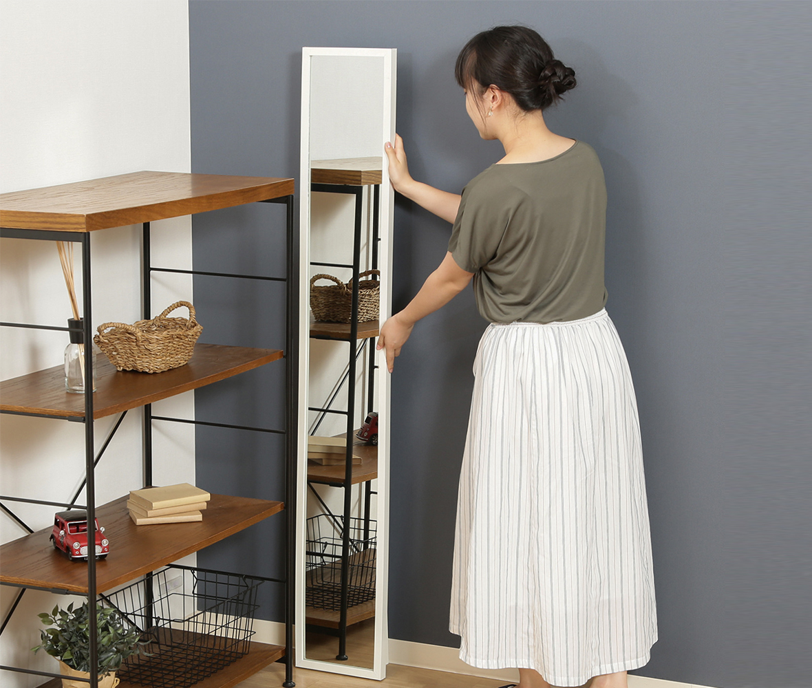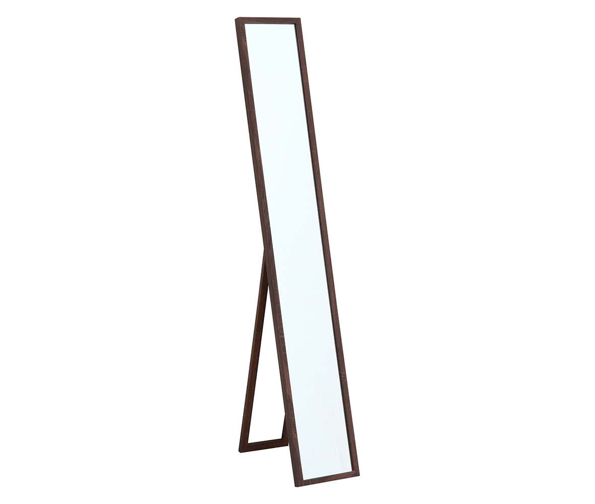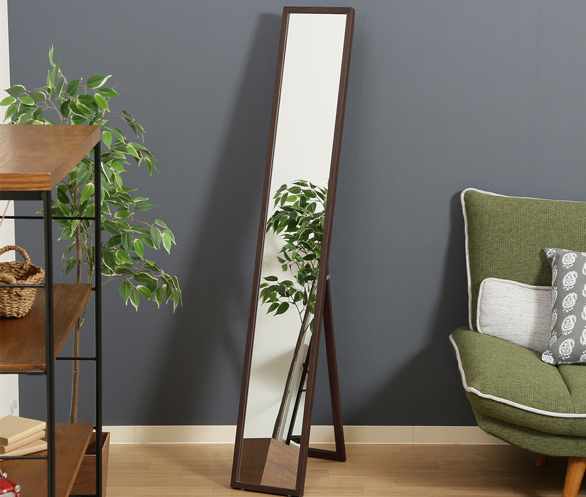 スタンド使用も壁掛けもできる幅23cmスリムサイズのウォールナットミラー。