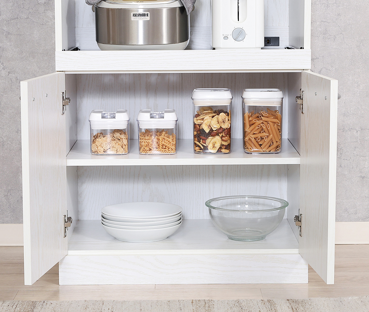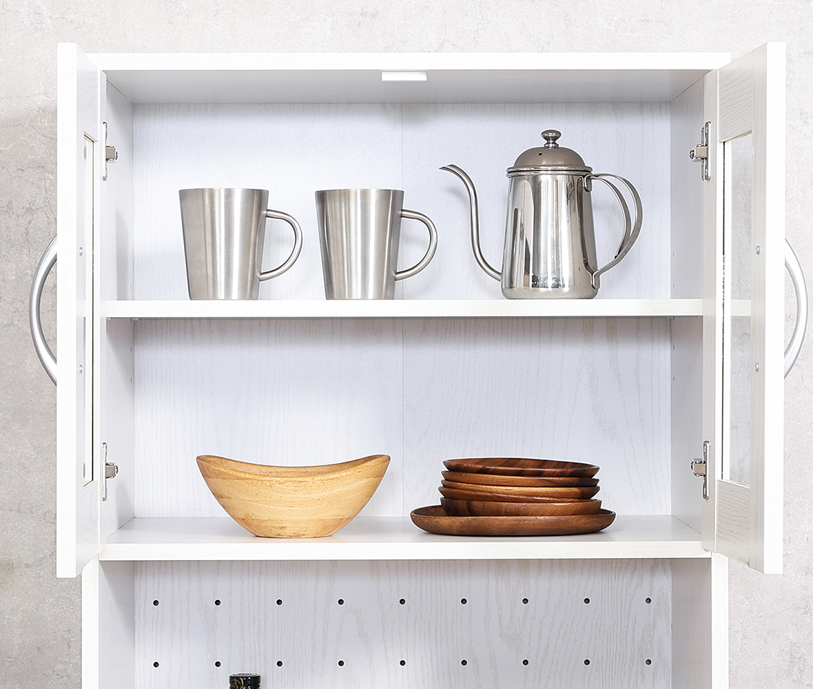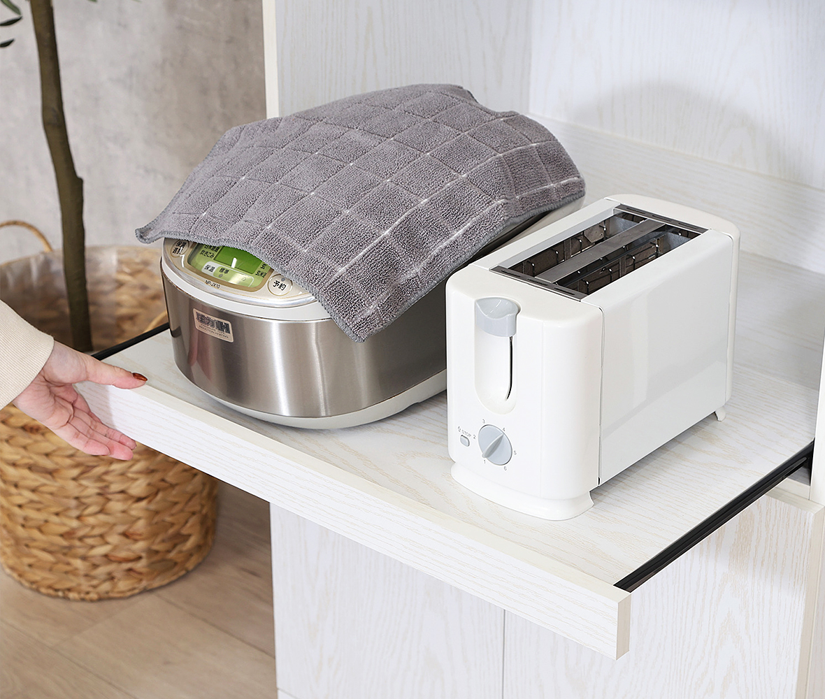 爽やかなホワイト色と温かみのあるオーク材の木目調が調和したデザインです。 スライド棚付きで炊飯器や電子レンジの収納に最適です。