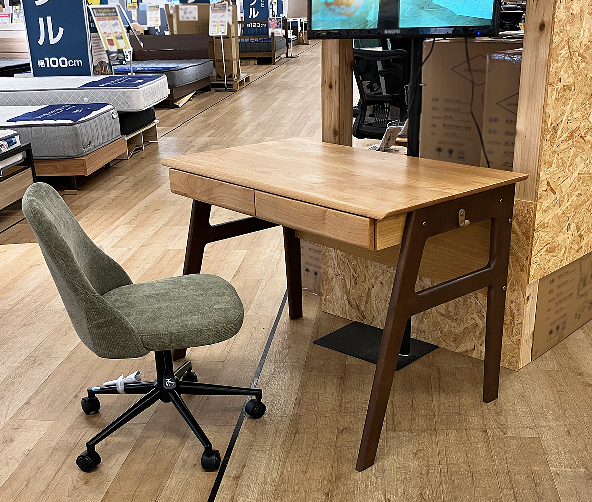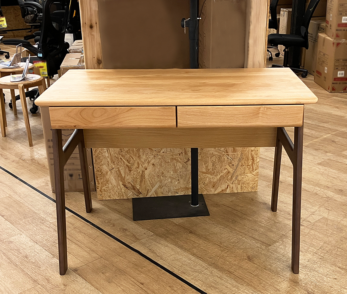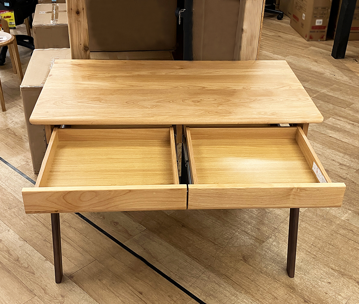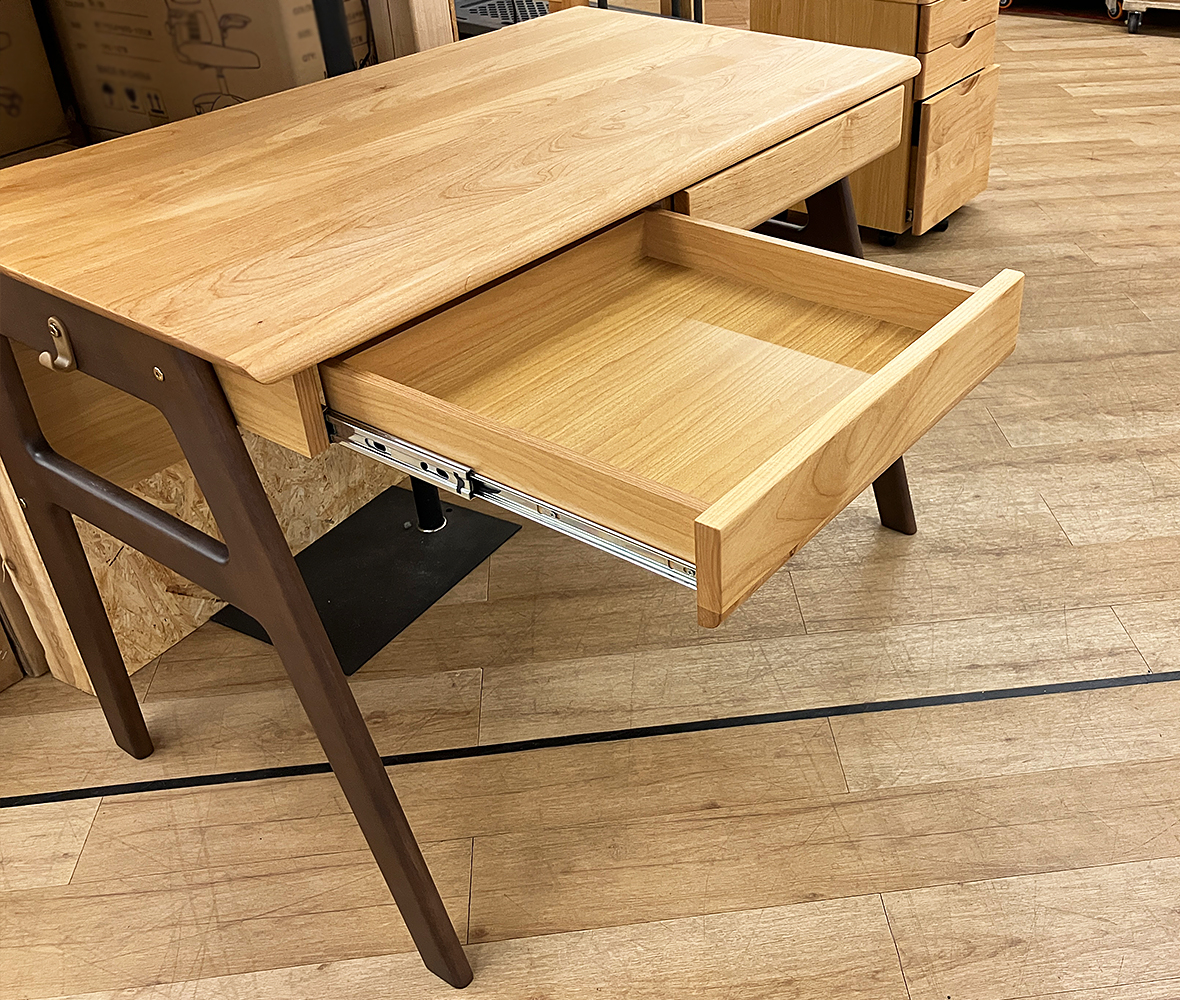 アルダー材を使用したぬくもり溢れる天板。ナチュラルとブラウンのツートンカラー個性的なデザインです。ノートやタブレットが収納できるゆったりワイドな引き出しです。
