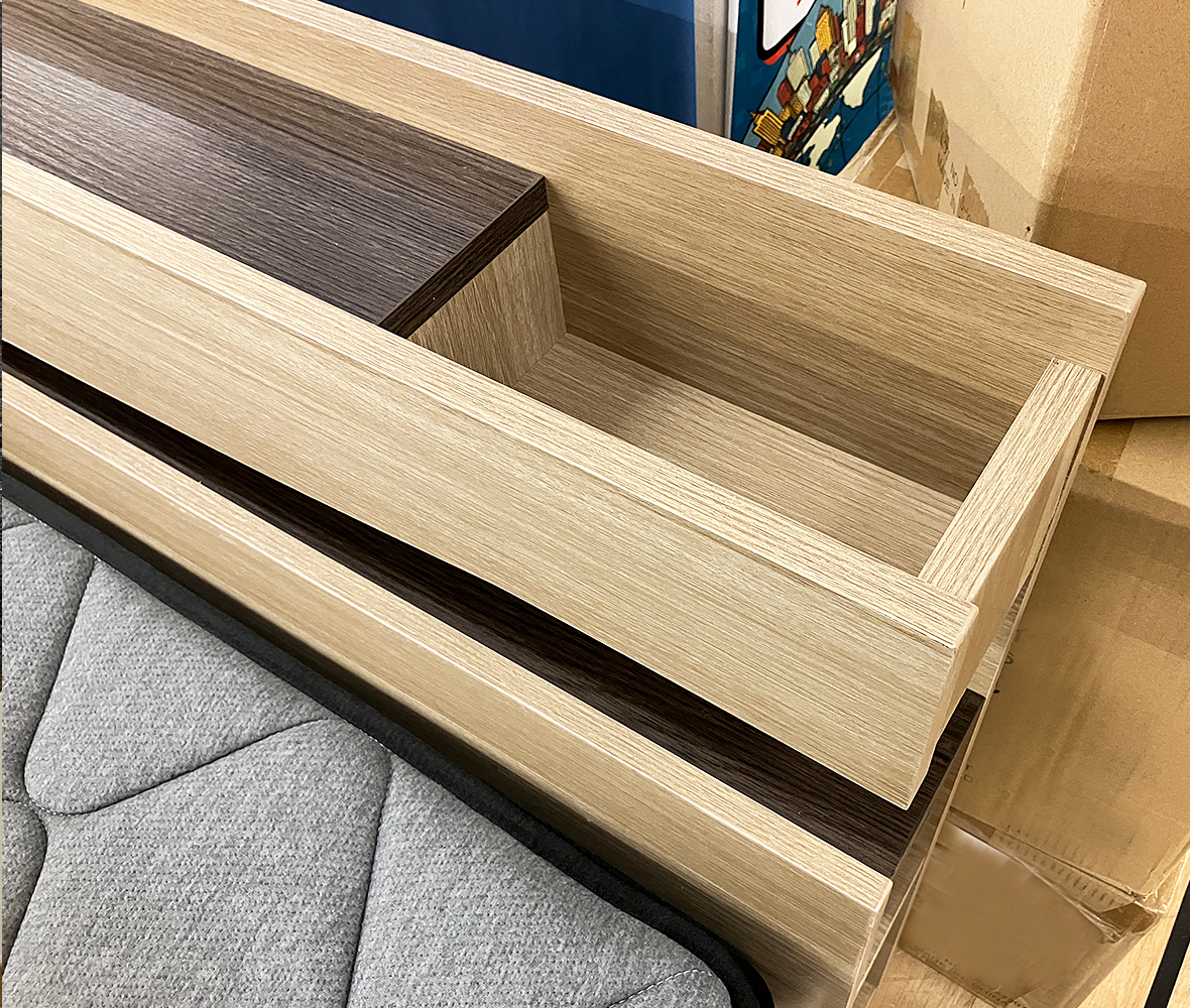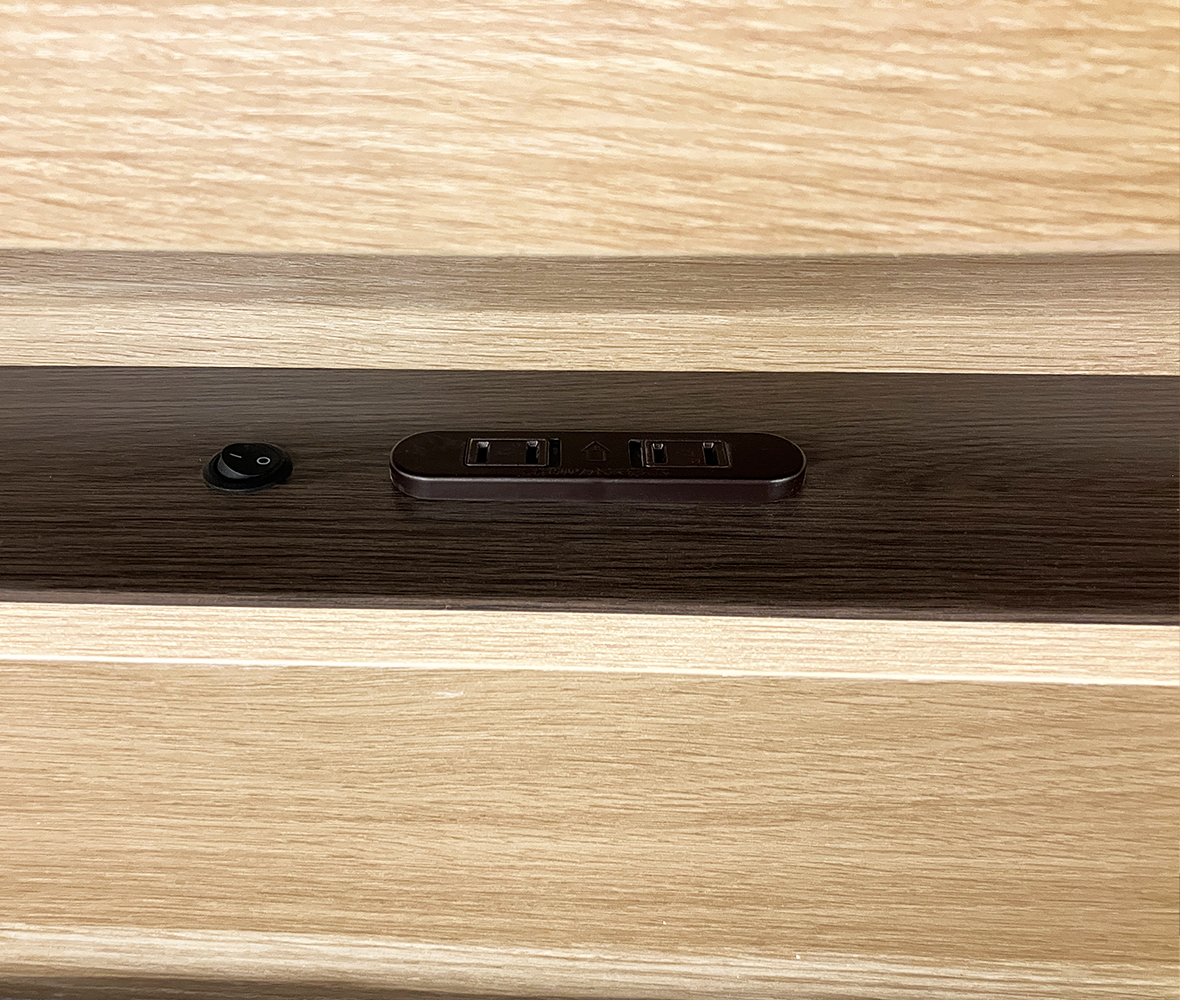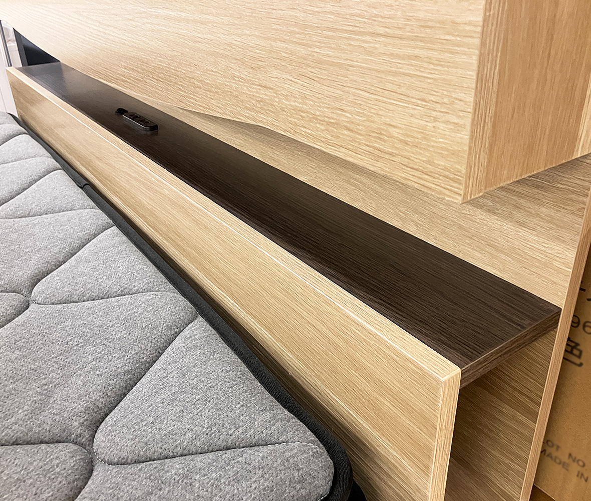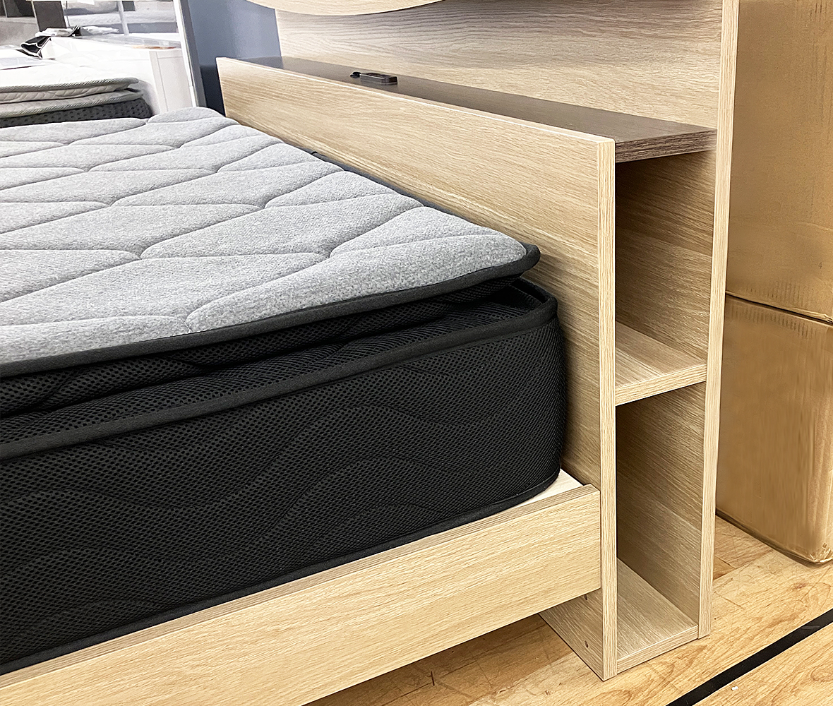 ヘッドボードの収納スペースに注目!タブレットやテッシュ収納ができるくぼみ有り!しかもLED照明、コンセント2個口で使い勝手良し!マットレスはピロートップ仕様の硬めポケットコイルです。
