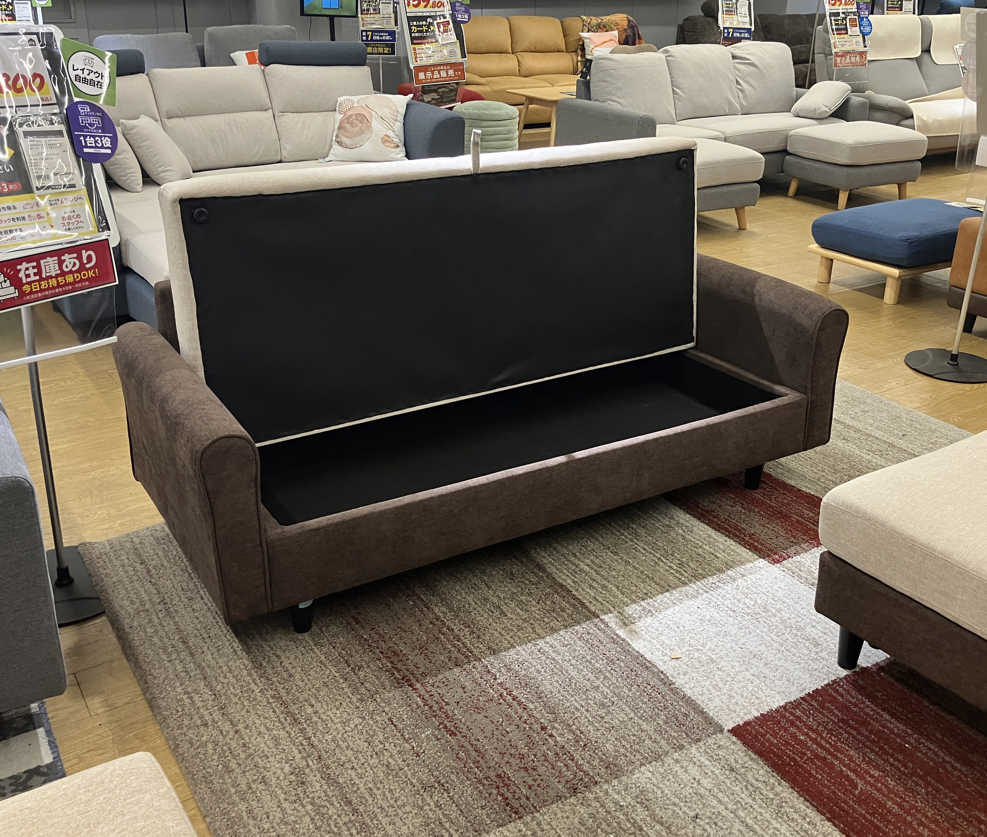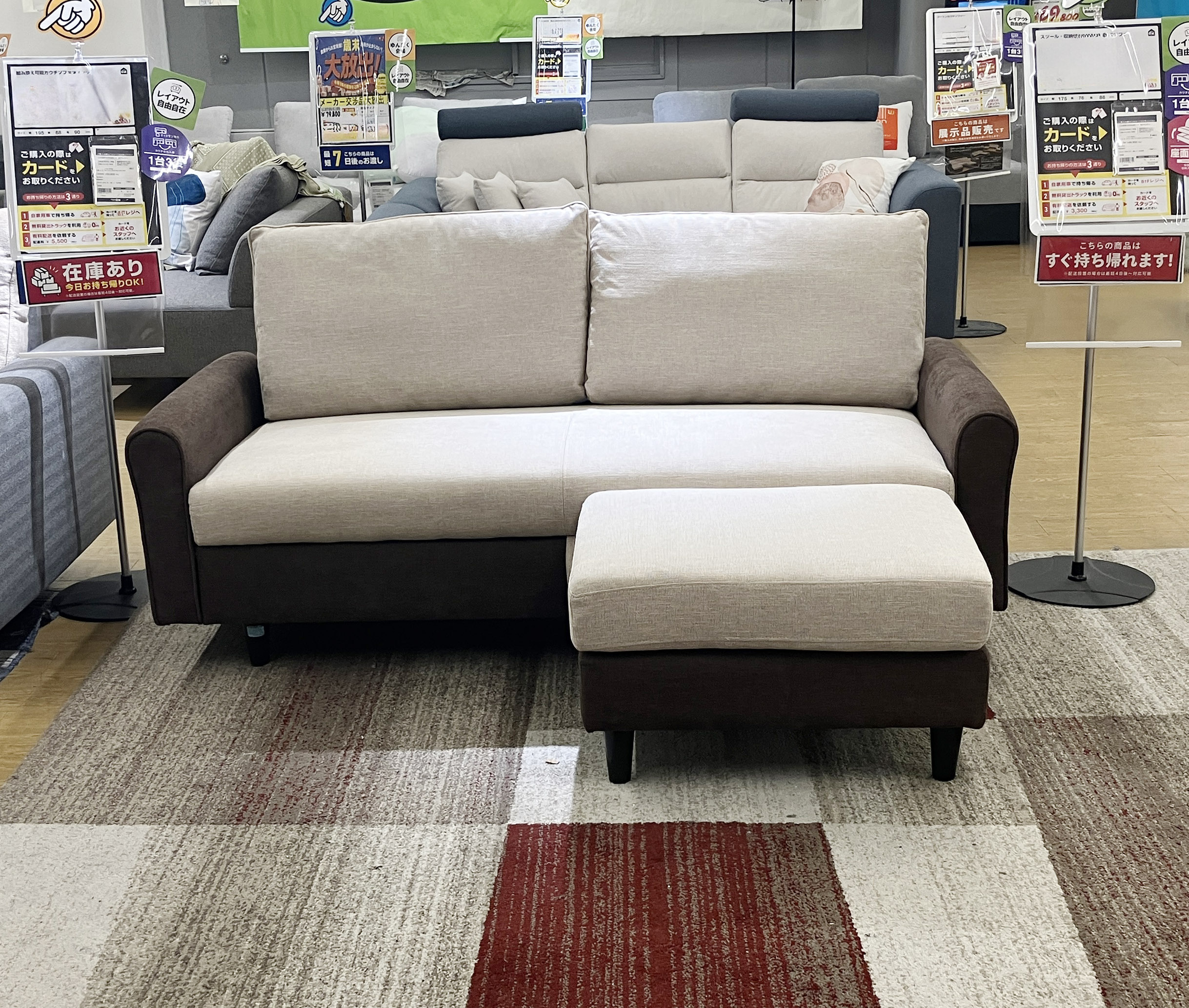 購入後、すぐ持ち帰れる♪座面下には、便利な収納付き!お部屋に合わせてレイアウト自由自在な #スツール付き2.5人掛けソファ。落ち着いた配色と優しい肌触りのファブリック生地だから、自然とお部屋に馴染みます。