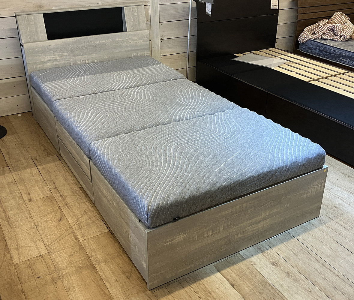 お部屋に合わせやすい!大容量収納の #シングルベッドセット。フレームは、引き出し4杯付き&コンセント+ライト付きで使い勝手◎マットレスは便利な3つ折りタイプで高密度ウレタンで体をしっかり支えて快適な眠りをサポートしてくれます。