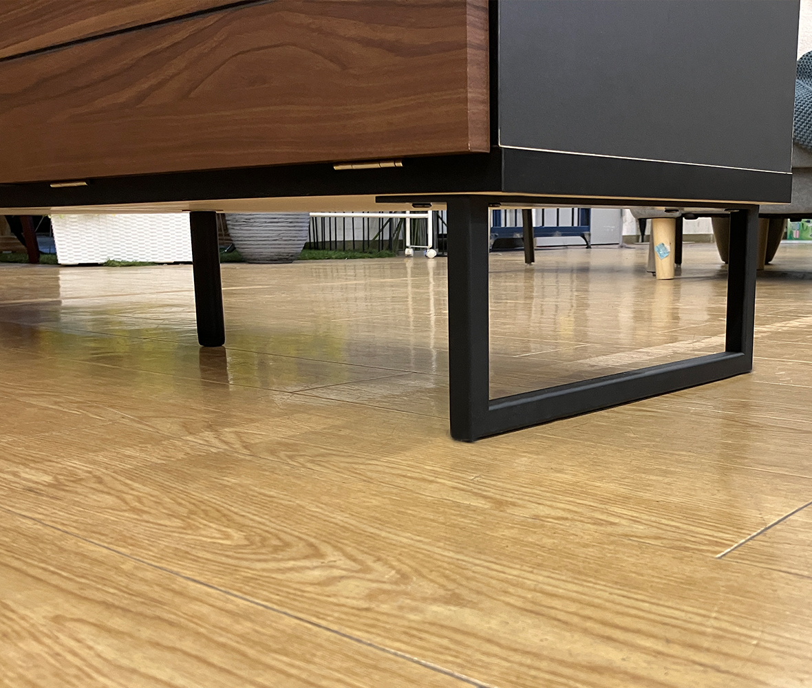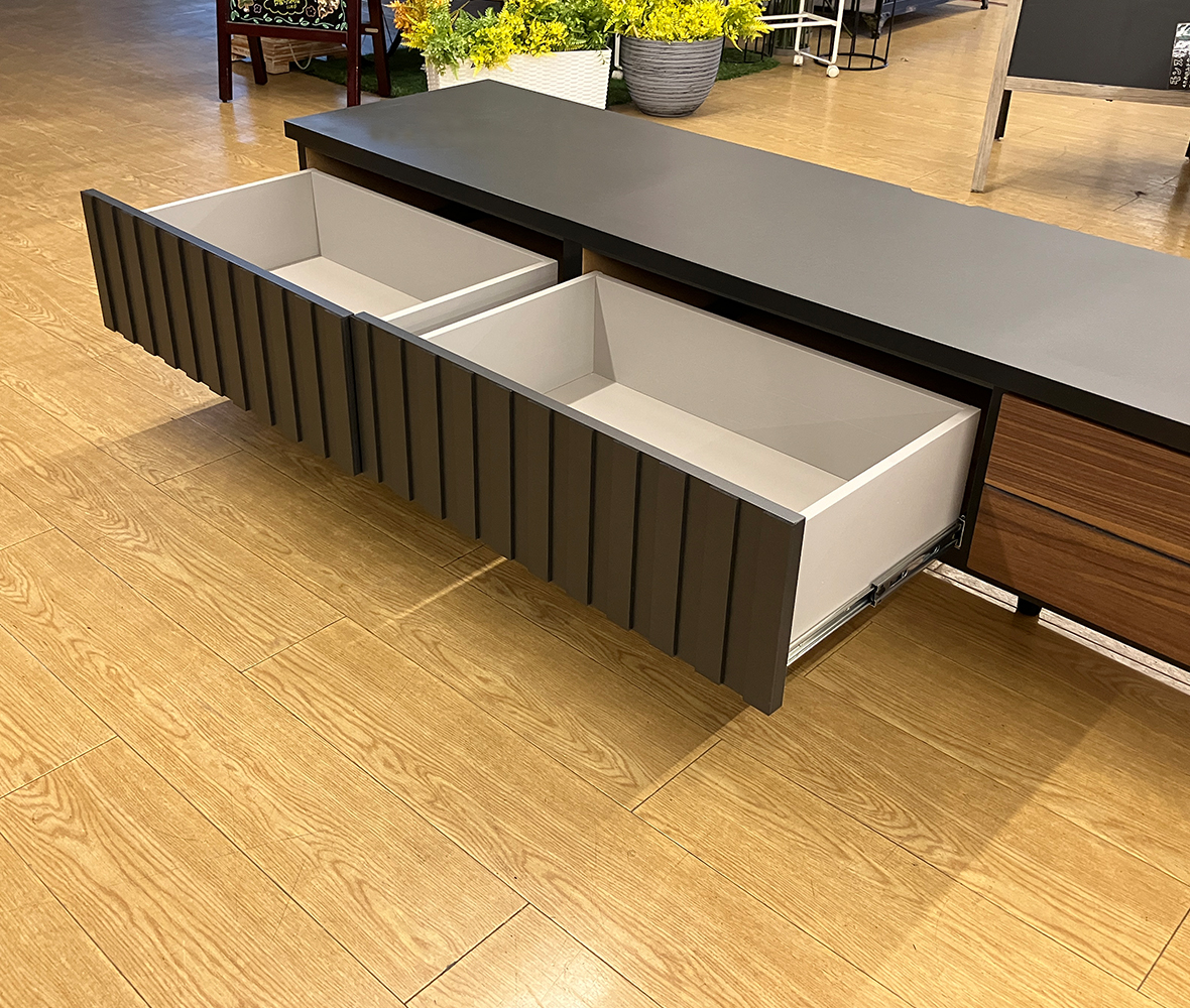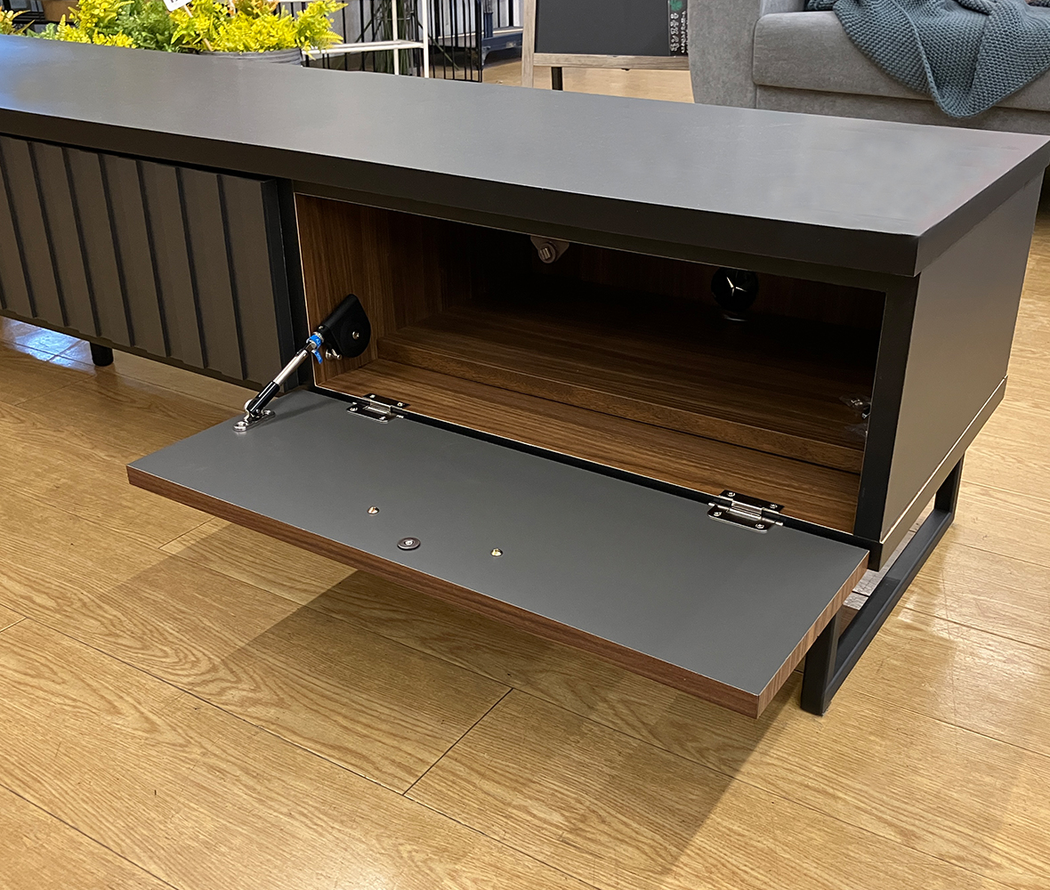 格子デザインの前板と、3トーンカラーが目を惹くオシャレな #TVボード。引き出し2杯はフルオープン仕様で、奥までスムーズに出し入れOK!さらに、ダウンステー仕様の収納スペース付きだかららっぷりしまえて実用性◎圧迫感のないアイアン脚は、お部屋がスッキリみえてお掃除もラク!