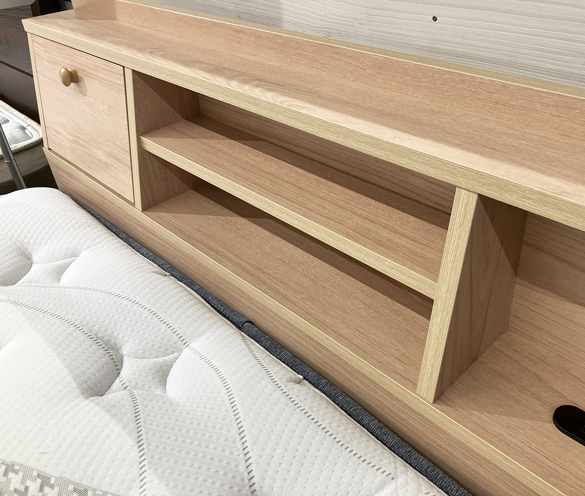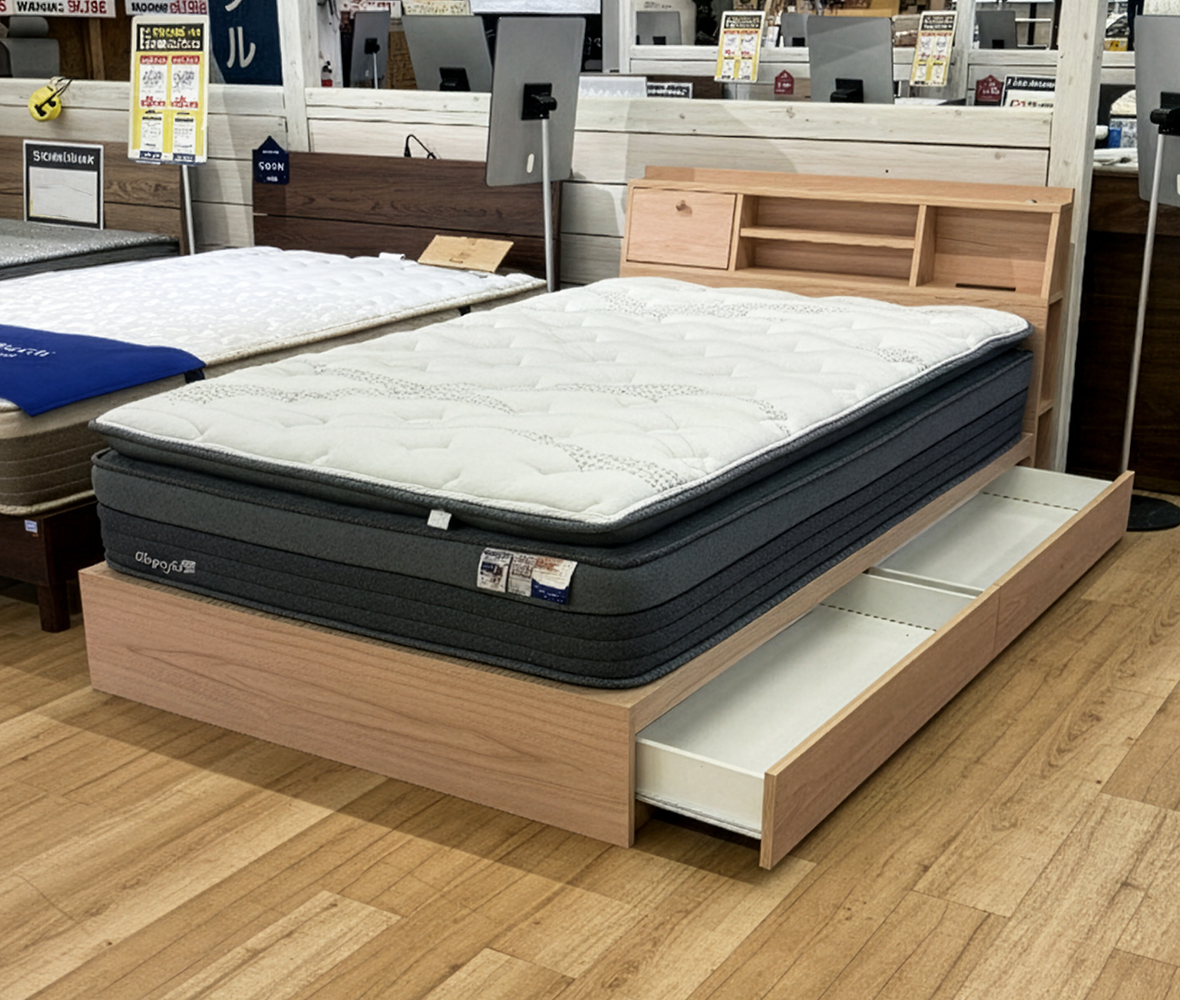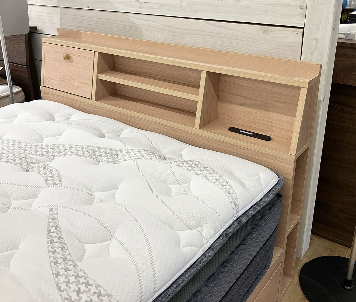 引き出し収納付きで、お部屋もスッキリ!今日持って帰れる #セミダブルベッドセット。ヘッドボードにはコンセント+照明付き。スマホ充電も可能。マットレスは、低反発のやさしさと、ポケットコイルの安定感◎