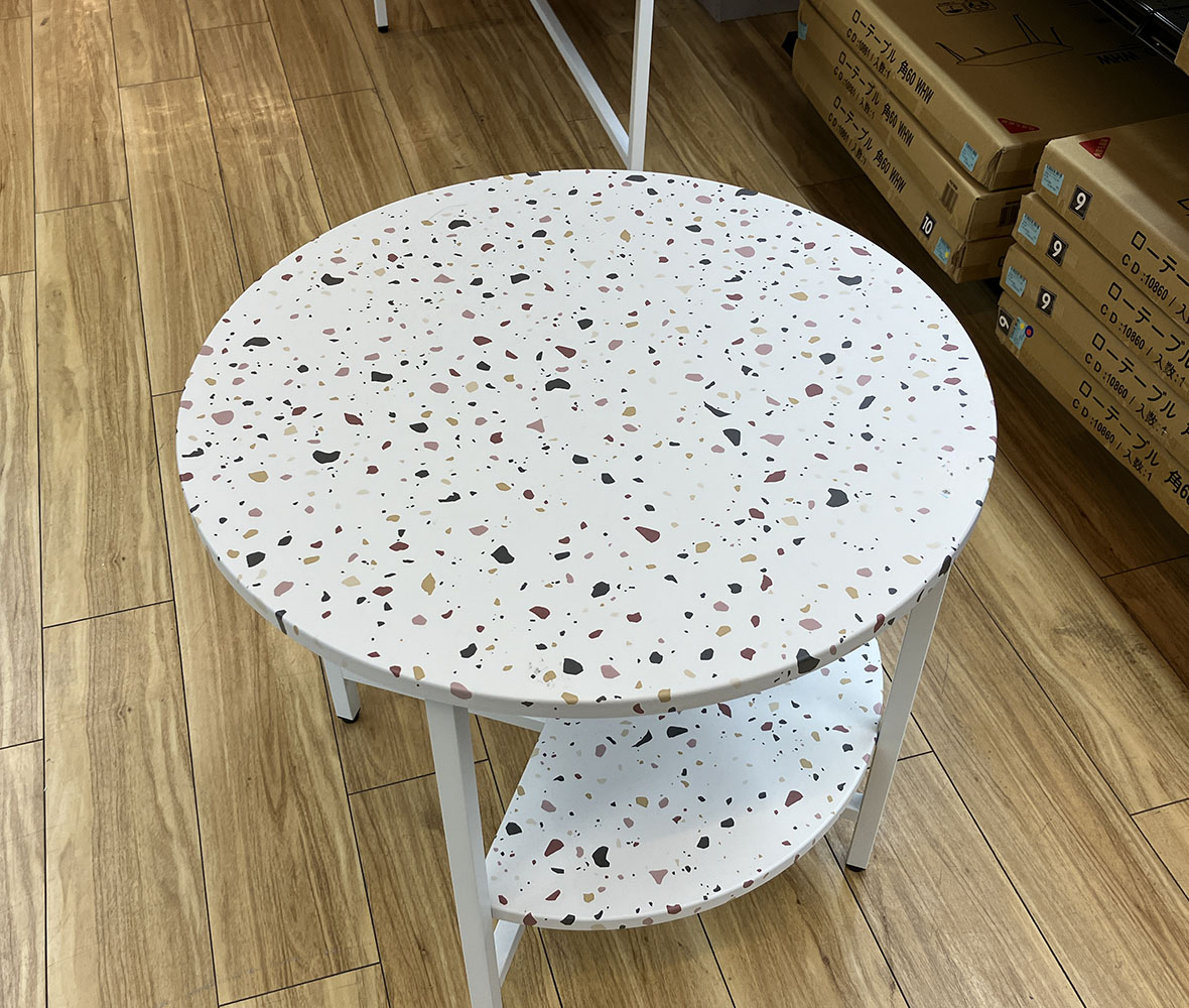 韓国インテリアにピッタリ!おしゃれで可愛いテラゾー柄 #ローテーブル。白を基調に、ピンクやアイボリーを散りばめたテラゾー柄が目を引くデザイン◎2段天板仕様なので、作業スペースとディスプレイを使い分けて楽しめるのもポイント!