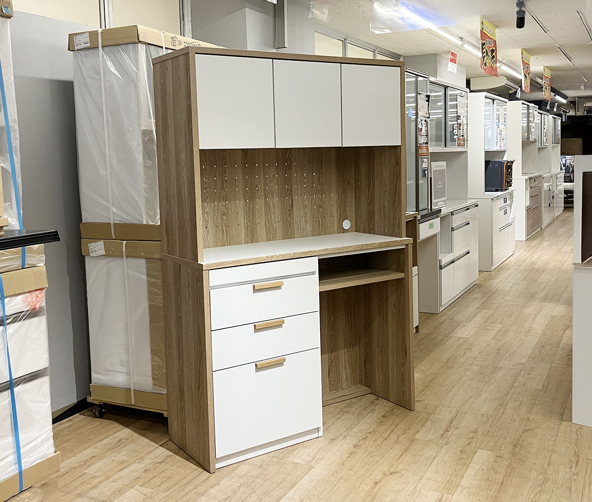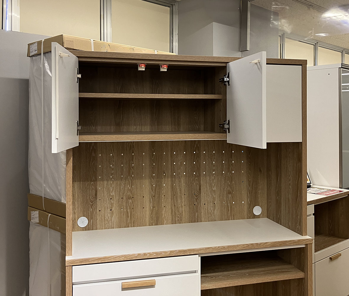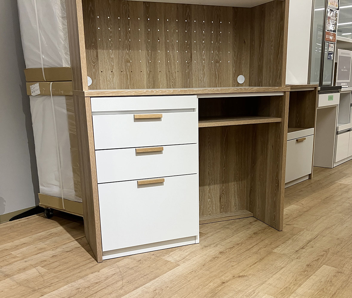 ツートンカラーが特徴のおしゃれな国産 #ダイニングボード。オープンスペースには有孔ボードを採用し、自由にアレンジOK!さらにスライドテーブル付きで、炊飯器や家電の作業スペースとしても便利◎