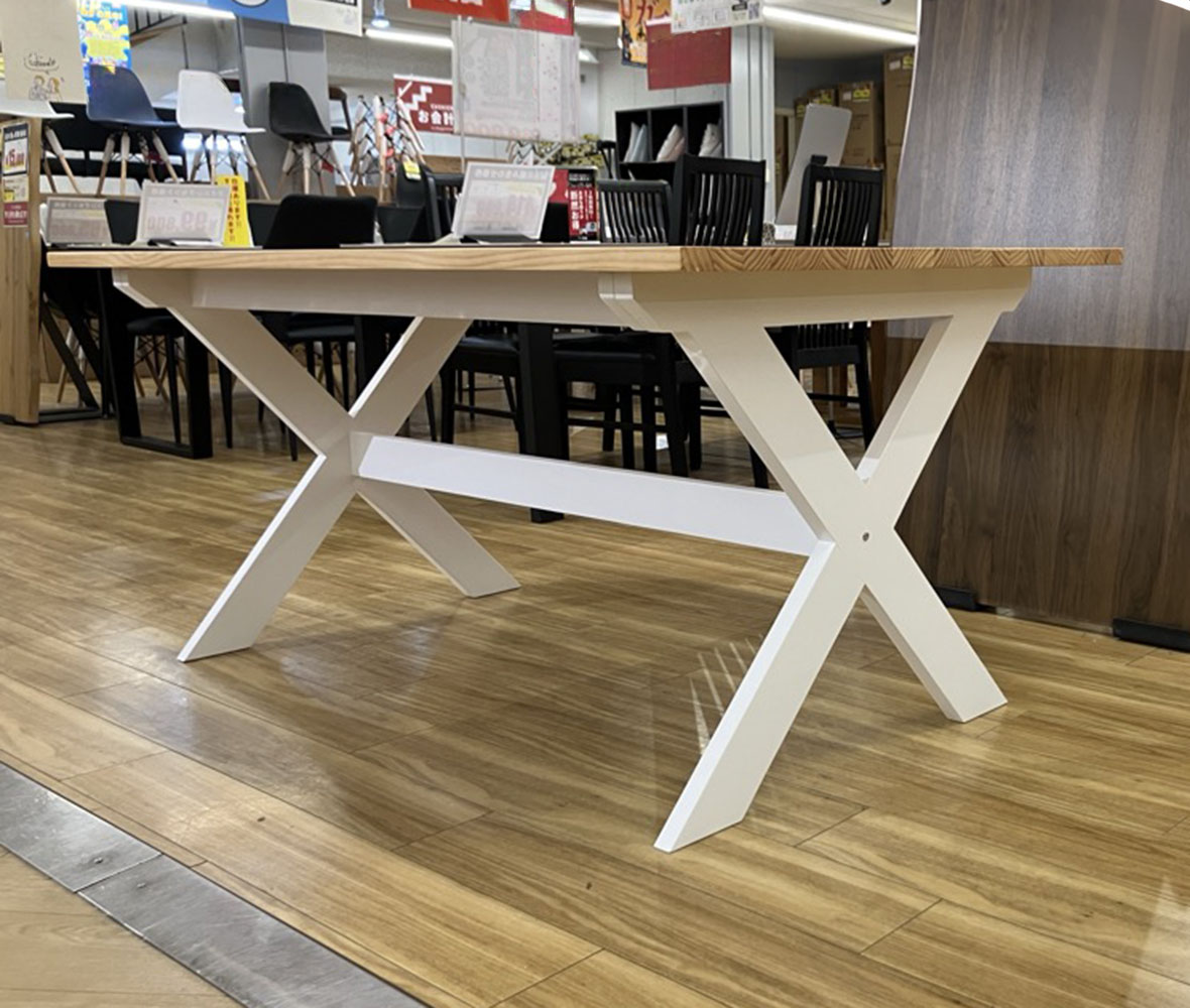 幅150cmで4人でもゆったり使える!ナチュラルな木目天板とホワイトのクロス脚が映える!カントリー調 #ダイニングテーブル。柔らかな色使いが空間を明るく演出し、家族が自然と集まる心地よいひとときを叶えます。