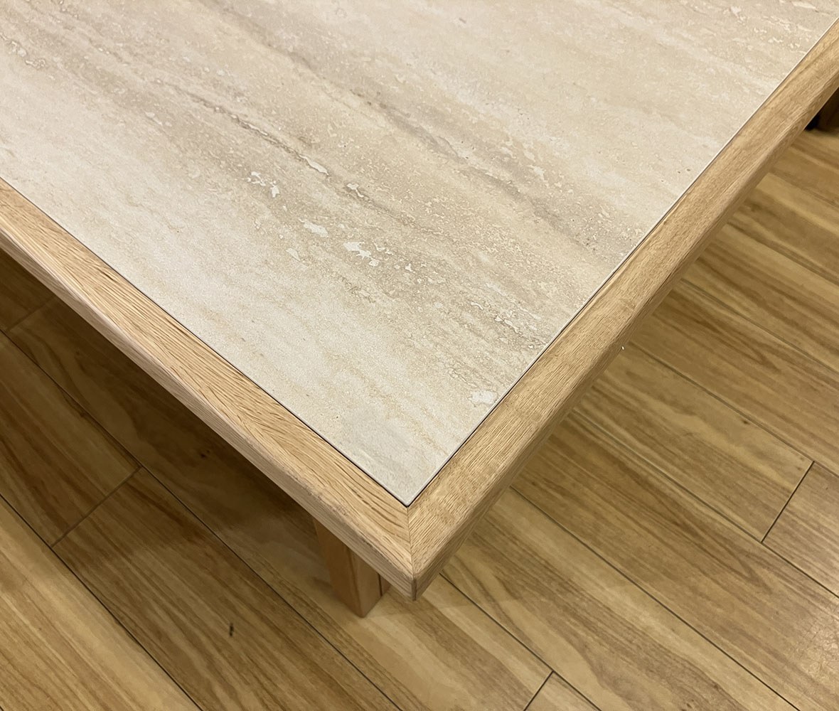 < #プレミアム1点限り>木の温もりと石目調天板が調和した、上質感あふれる #ダイニングテーブル。天板はセラミックだから、丈夫でお手入れラク♪しっかりとした脚デザインで安定感も抜群!サンプル品のため他にはない特別な一台です。