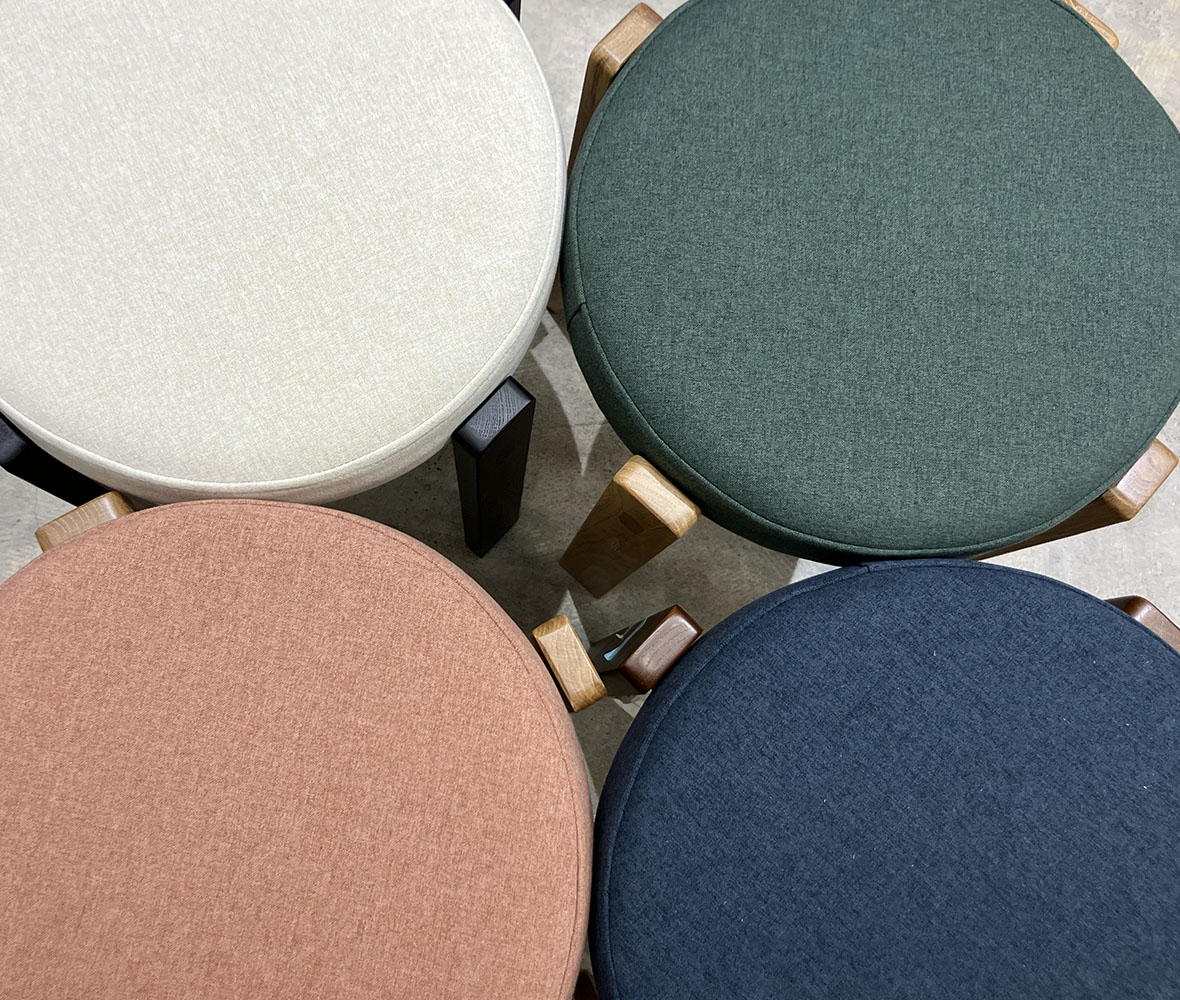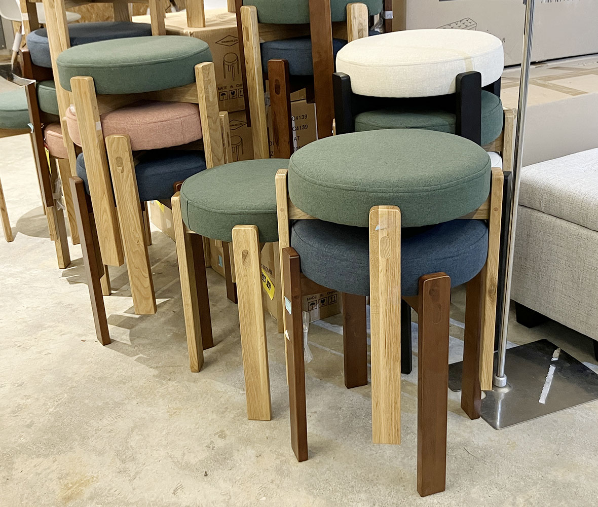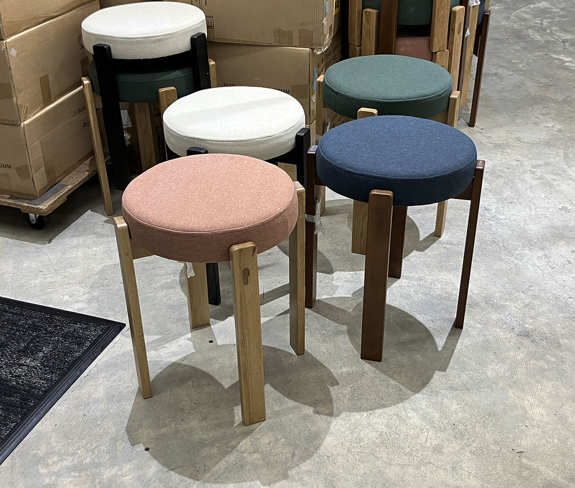 急な来客時やちょっと腰掛けたい時に便利!丸型のキュートなデザインの #スタッキングスツール。肌触りのよいファブリック生地の座面が心地よく、重ねて収納できるから、お部屋の隅に置いてもすっきりと収まります。