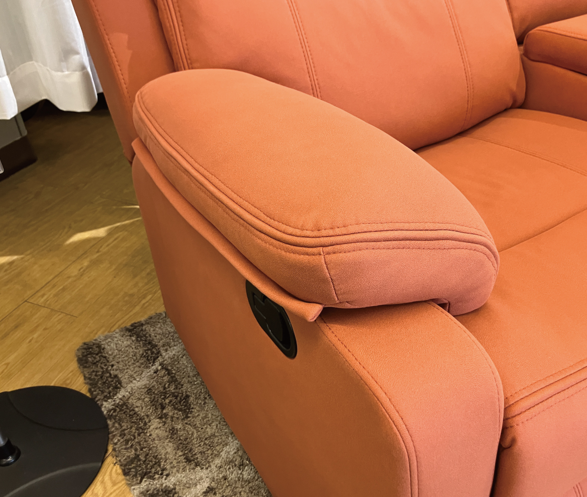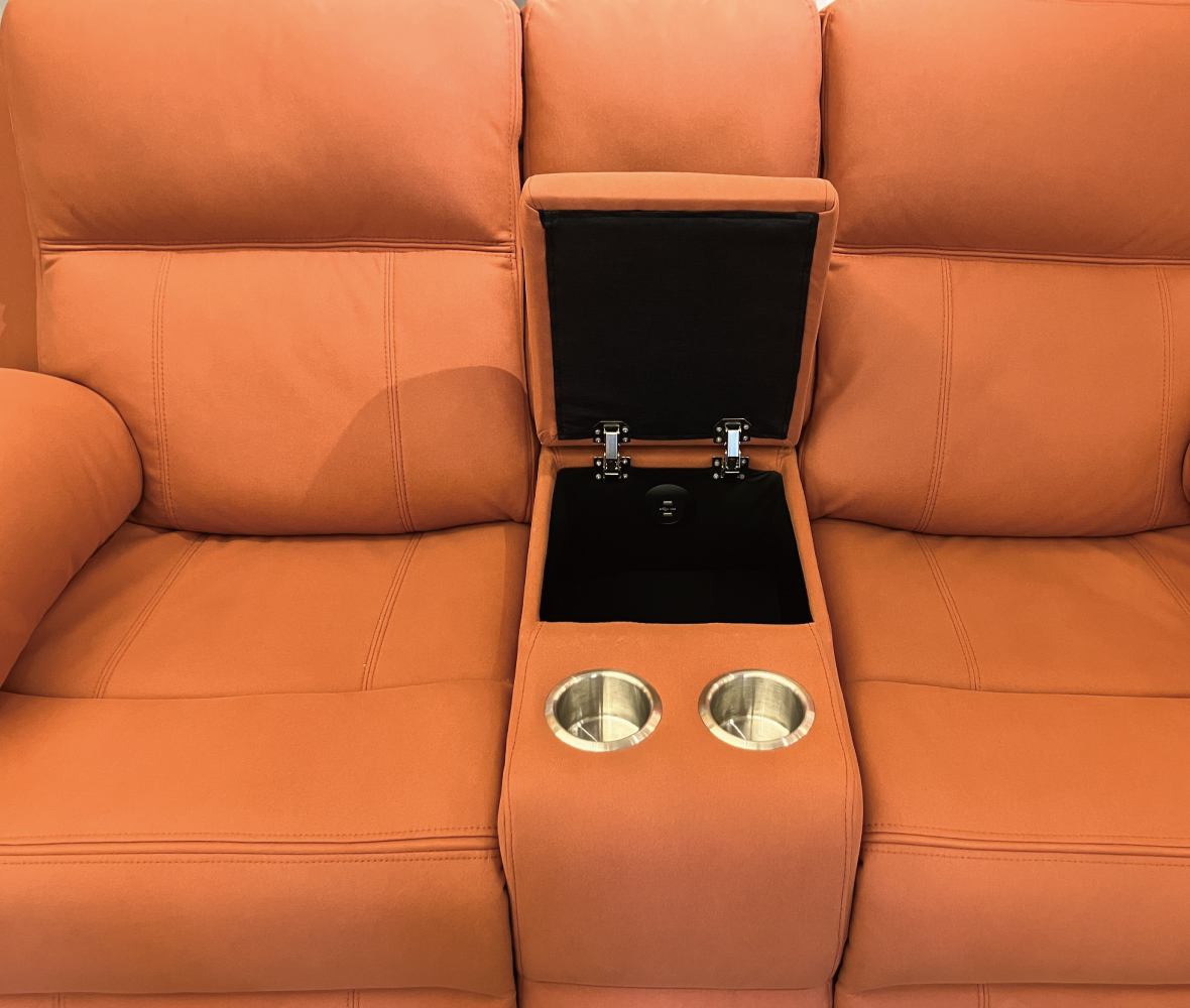 かっこいいレッドカラーの#電動ソファ!中央にドリンクホルダーと収納付き!収納をぱかっと開けるとUSBポート!スマホ充電も出来て便利◎