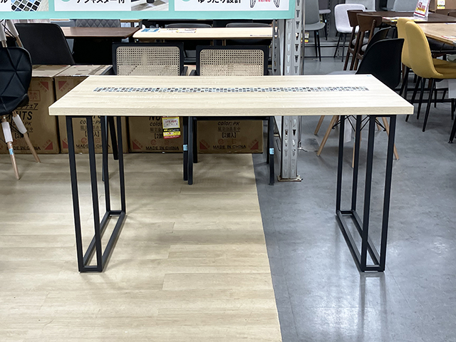 モザイクタイルのアクセントがオシャレなテーブル◎天板はキズに強く、2重のアイアン脚で見た目スッキリ!グラつき調整のアジャスター付きです!